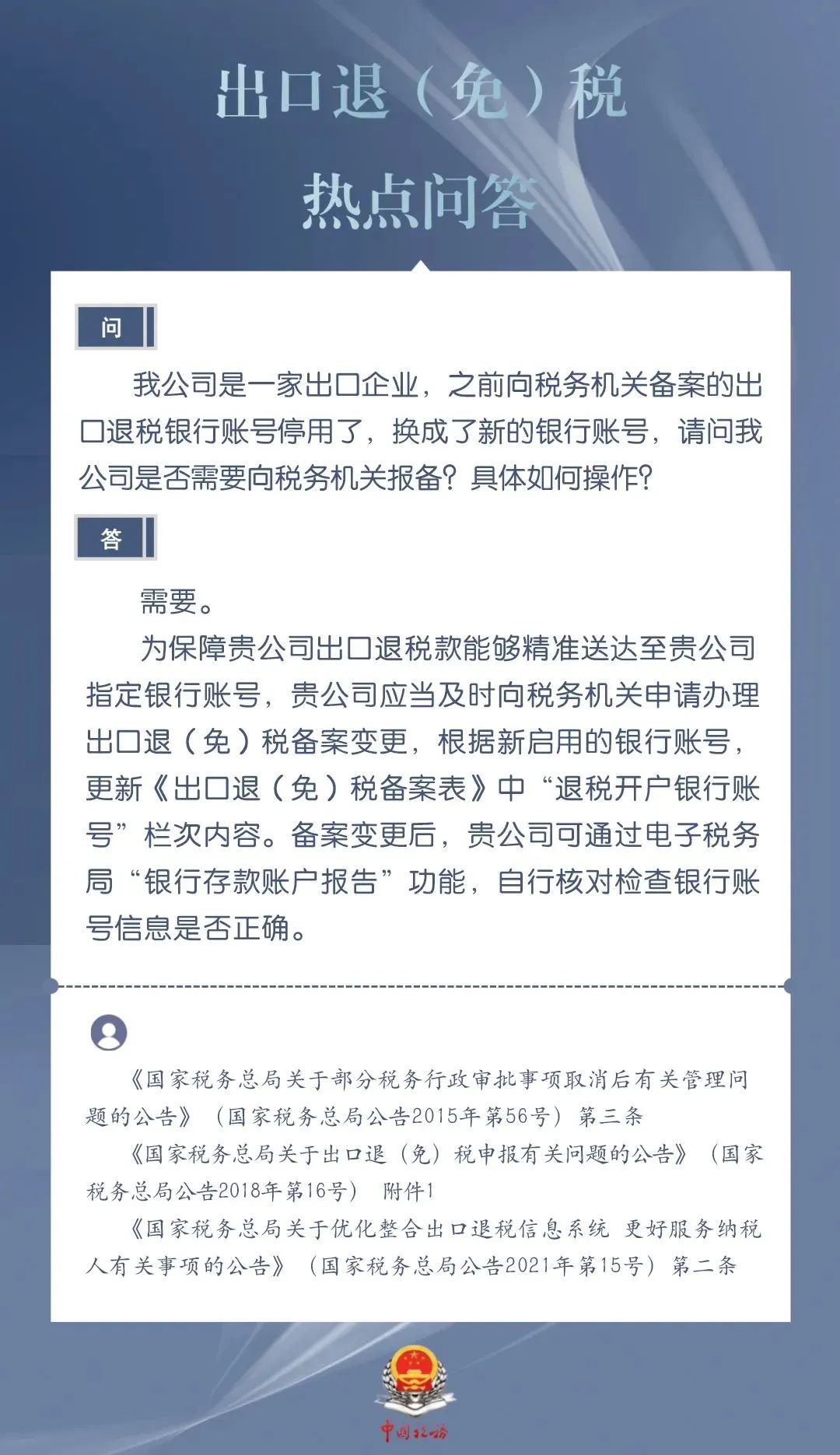 出口退税银行账号停用换新,出口企业要向税务机关报备吗?具体如何操作?