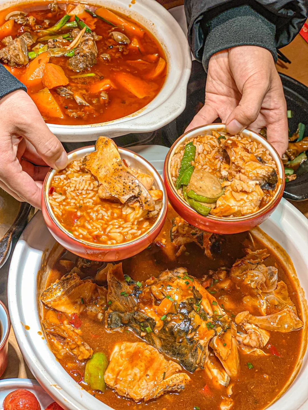 有异曲同工之处的是鱼头泡饭。先吃肉质鲜嫩的胖头鱼,再把酱色的鱼汤一股脑浇在饭上,粒粒分明的大米瞬间吸饱汤汁,真香。