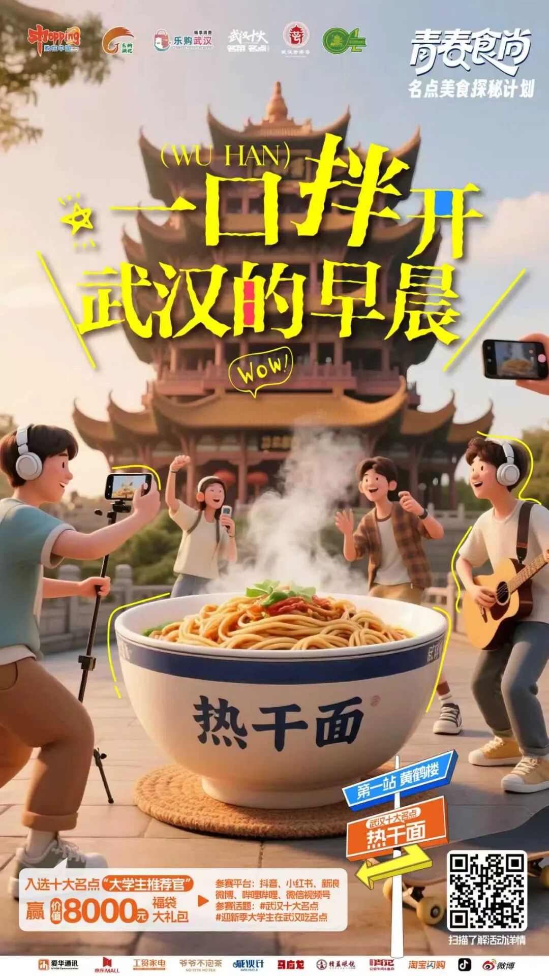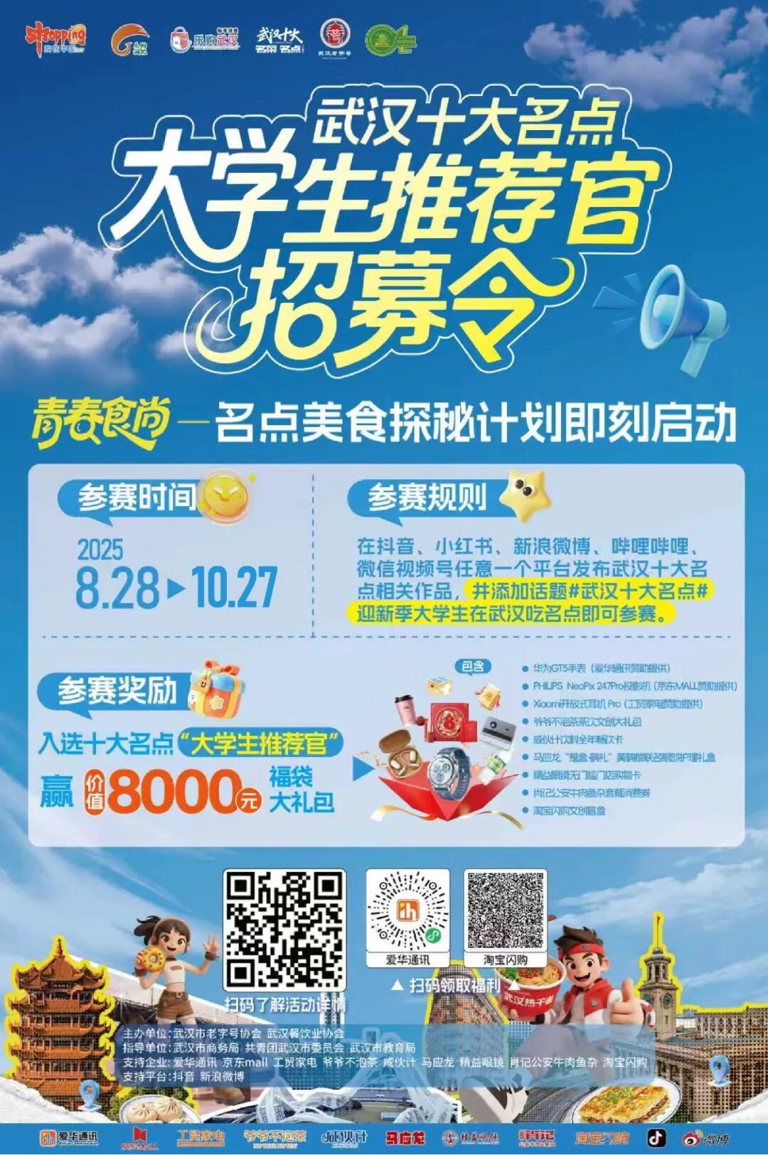 即日起至10月27日,带话题#武汉十大名点 #迎新季大学生在武汉吃名点 在抖音/小红书/微博/B站/视频号发布作品即可参与。