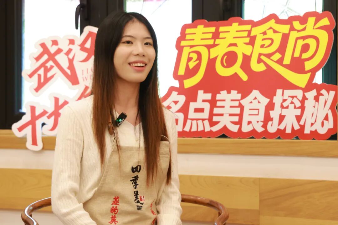 在三镇民生甜食馆,第四代传承人曼玲姐热情接待了同学们。她动情地分享:"在我们店里,经常能看到一家四代人一起来过早,这里承载着江城的烟火气,更能看到一代代的传承。"
