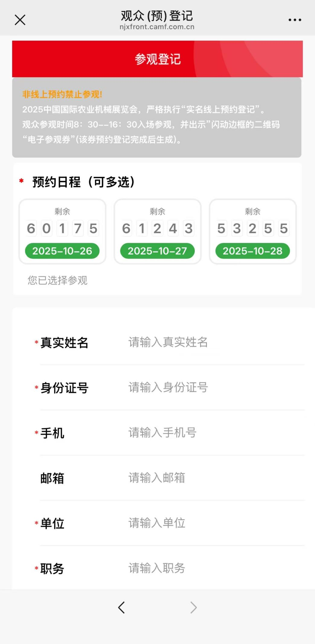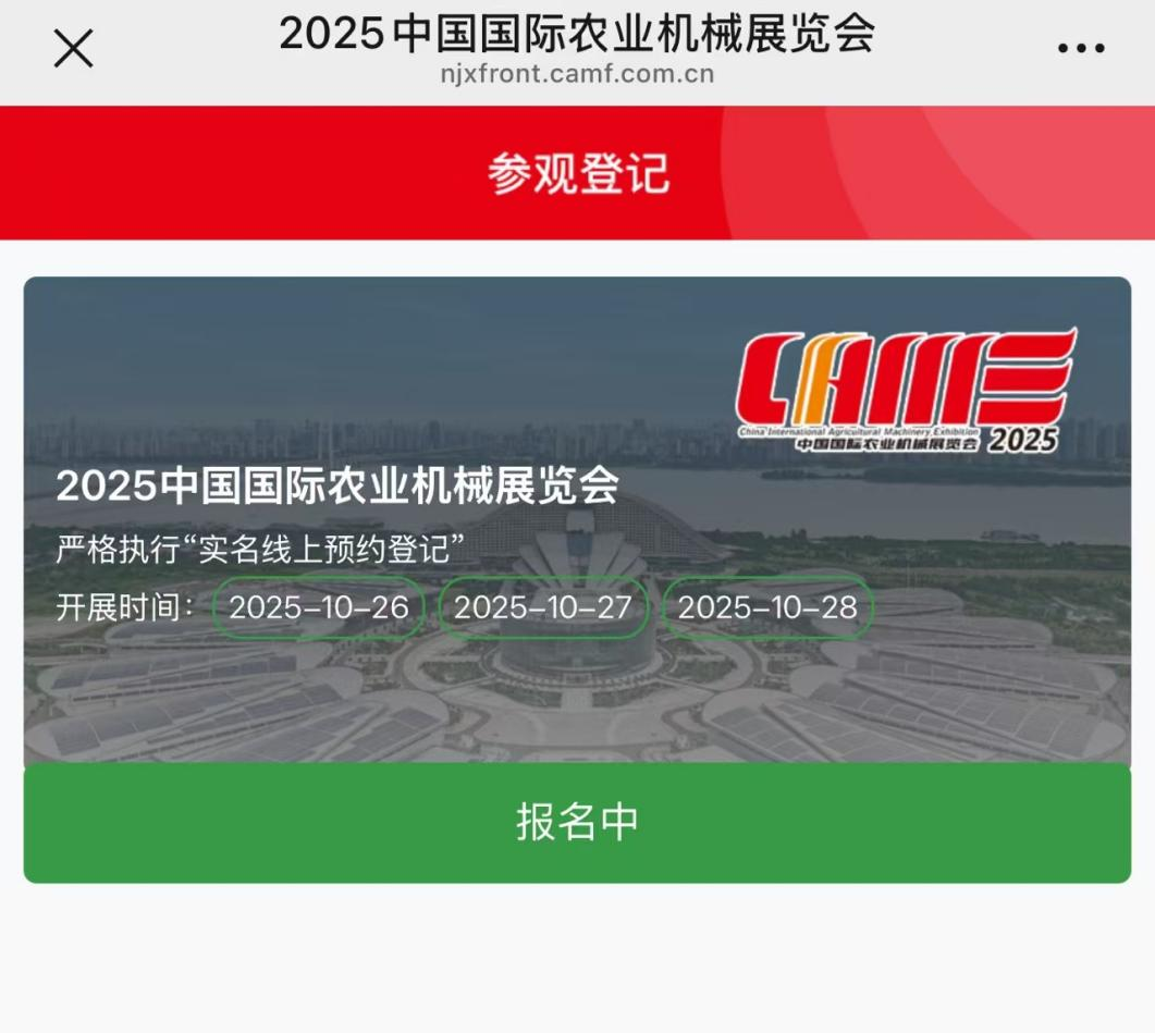 登录际农机展官网:www.camf.com.cn点击“我要参观”,依次选定参观日期、填报个人基本信息、调查问卷,提交后关注国际农机展官方微信“国际农机展CIAME”,点击“我要参观”并绑定手机号码,即可生成闪烁二维码的“电子参观券”,完成预约登记。现场出示“电子参观券”,并接受扫描二维码后领取观众证快速入场。