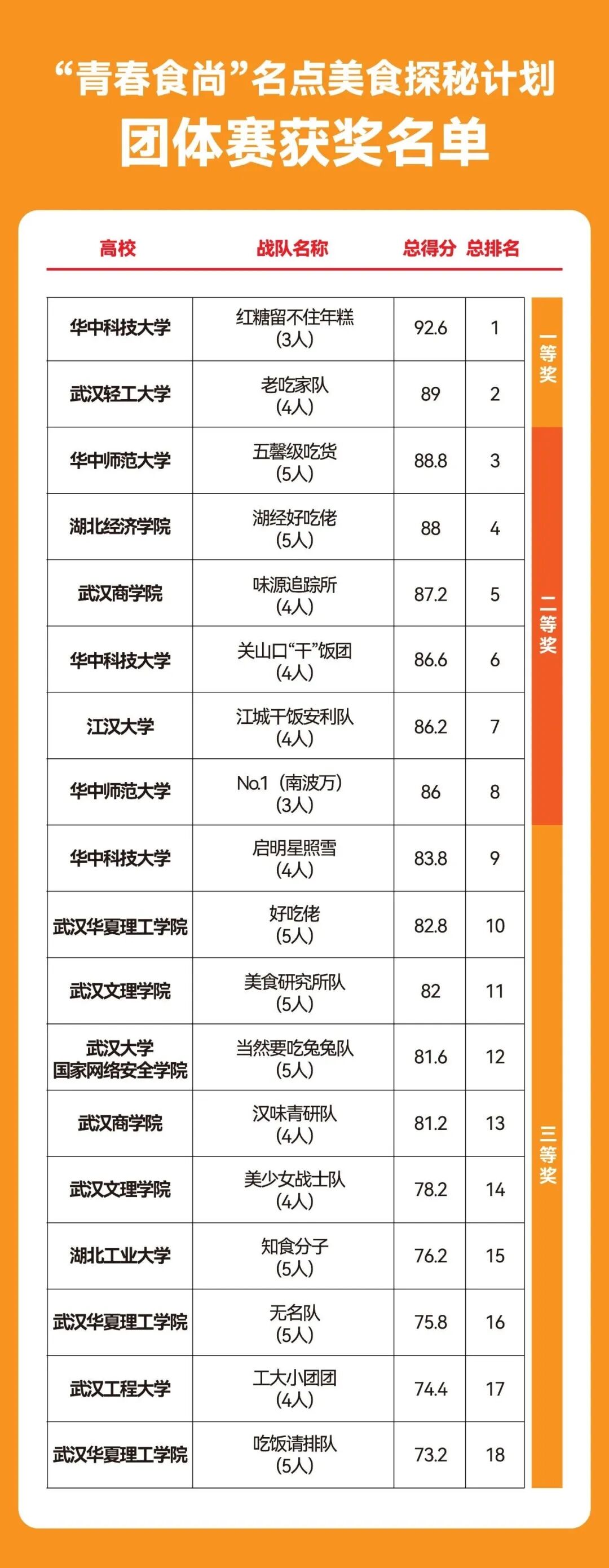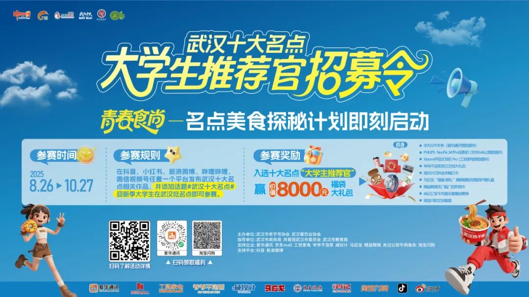 发布日期:2025-11-24 08:44:24 文章来源:武汉商务近日,2025年“青春食尚”武汉十大名点“大学生推荐官”评选结果揭晓,10位大学生从13所高校的参赛者中脱颖而出。这些年轻人运用短视频、探店Vlog、图文测评等创新形式,为传统武汉美食注入了全新的传播活力。