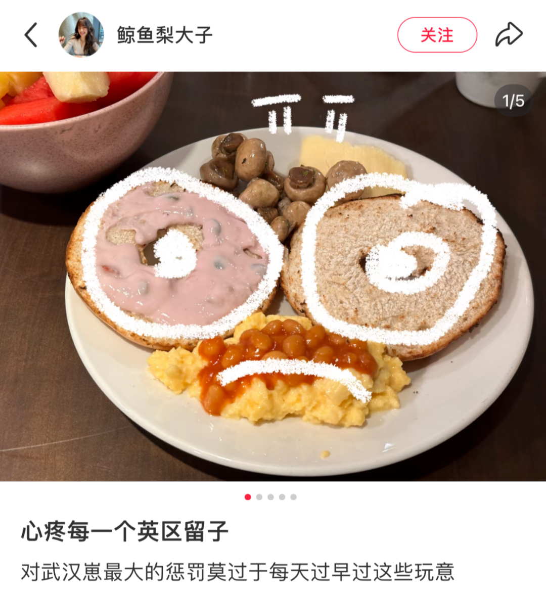 悉尼网友晒出13.5澳元的炸鸡能量套餐,伦敦朋友发来2.99英镑的预制早餐,北美打工人100元的早餐只有一个小牛角包+一杯热美式,还有武汉崽在英国留学受“惩罚”的过早……正看得心有戚戚,手指突然滑到武汉的帖子——