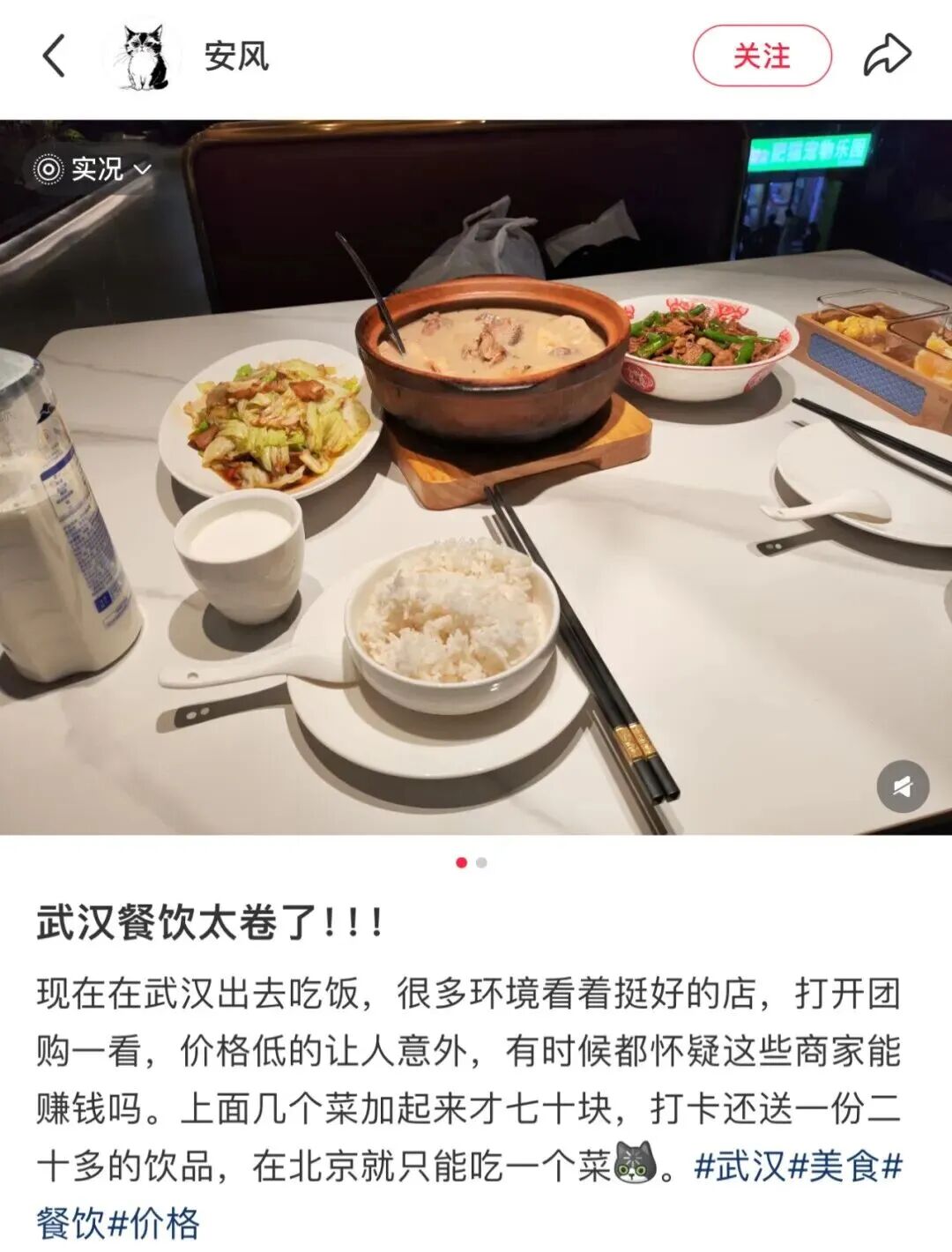 更绝的是游客发现的那个 “70元藕汤套餐” :一铫子煨得浓白的排骨藕汤,加一份扎实的辣椒炒肉,再来个酸辣包菜。在很多一线城市,这个价格可能只够点一道硬菜,但在武汉,这是一顿能从中午回味到晚上的“硬核正餐”。