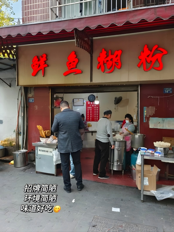 武汉人把鸡冠饺和鲜鱼糊粉当作黄金搭档。这家鲜鱼糊粉早餐店已有26年,招牌简陋、环境简陋,但门口排着的一长条塑料凳证明了一切。