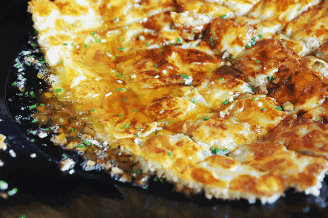 蛋皮一摊,糯米一铺,撒上卤水和配料,动作一气呵成。接下来就是豆皮在锅里自由舞动,锅一抖炉火撩动,一个华丽的翻身,金黄的豆皮迎来了它的人生巅峰。