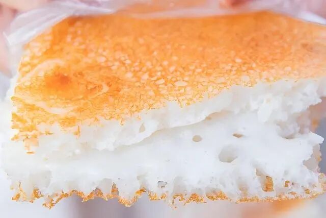 刚刚出炉的米粑有些烫手,金黄的外皮忍不住一口咬下,非常薄脆,内心细腻,越嚼越香。