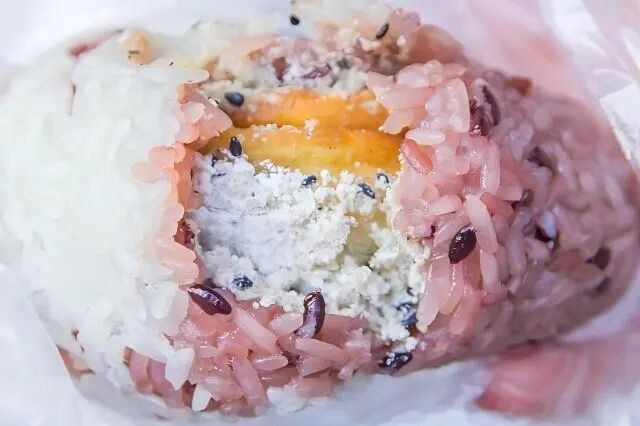 师傅操作相当熟练,有甜咸等各种口味,还有黑米白米可以选择。糯米晶莹剔透,黑米很香有嚼劲,小小的一个吃起来也不容易散,用的都是最质朴的食材,却做出了十分丰富的味道!