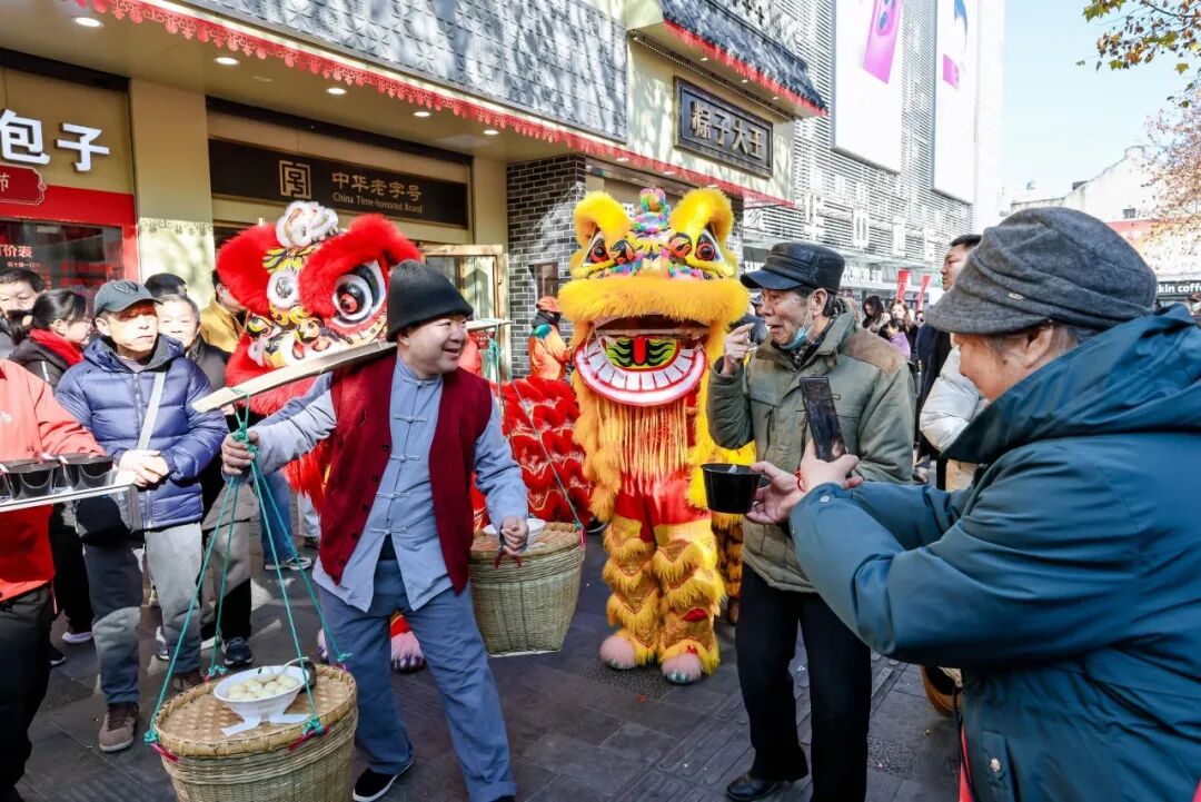 穿粗布短打的“挑担郎”肩挑竹担,沿街吟唱《卖汤圆》,路过的市民与“挑担郎”积极互动,即可免费试吃一碗叠式汤圆,沉浸式感受老武汉的市井烟火。“像穿越回小时候,奶奶带我买汤圆的场景突然就清晰了。”60岁的张阿姨接过汤圆,开心地说。