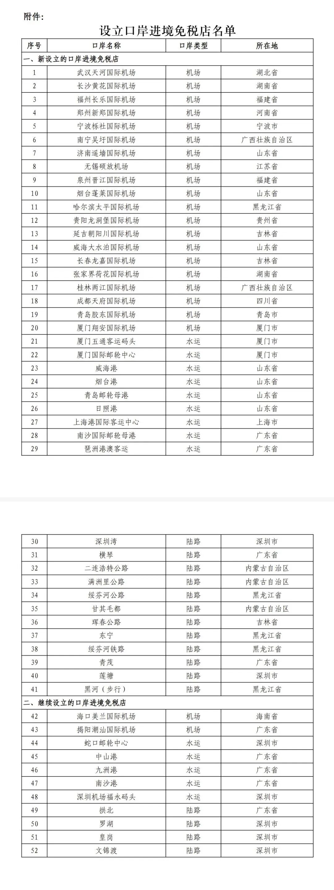 二、继续在海口美兰国际机场、蛇口邮轮中心等11个口岸设立口岸进境免税店(在本通知所附《设立口岸进境免税店名单》中为序号42—52)。