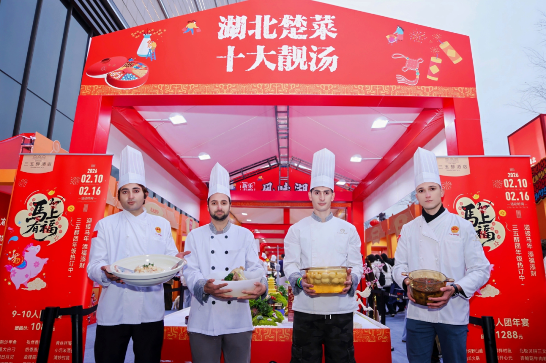 本土味道同样令人惊艳。扬子江、汪玉霞、蔡林记等40余家老字号携匠心年货集体亮相;来自全省17个市州的楚菜名厨现场烹制排骨藕汤、宜昌肥鱼汤等“荆楚十大靓汤”,搭配各式年礼礼盒,浓浓年味扑鼻而来。