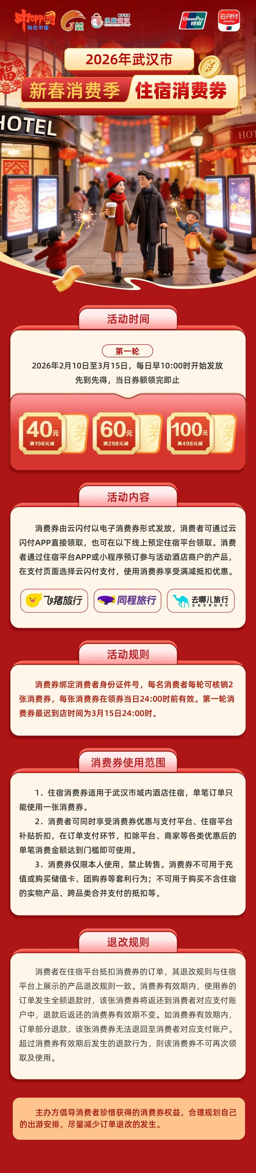 开抢倒计时!2026武汉新春消费季住宿消费券即将上线