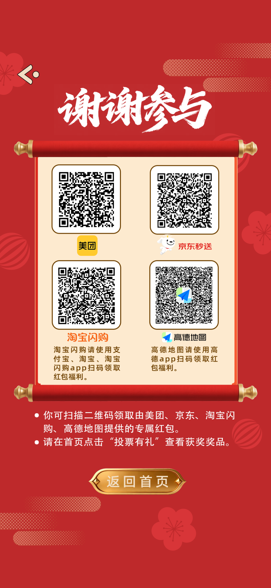 您的每一票都至关重要,而参与本身亦有惊喜。本次活动获得美团、京东、淘宝闪购、高德地图、爷爷不泡茶等品牌大力支持。每日参与投票,即有机会领取各大平台的专属消费红包。