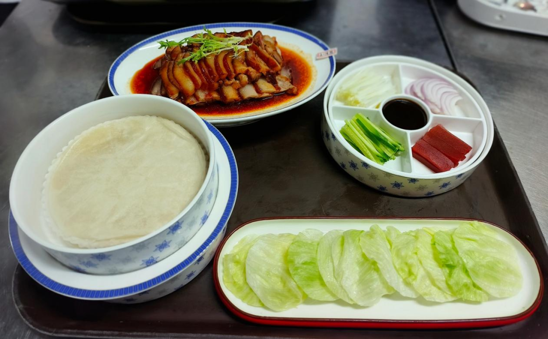 吃法类似片皮鸭:将烧腊放在荷叶饼上,搭配生菜,佐以甜面酱、葱条、黄瓜条等,卷起食用,满口鲜香。