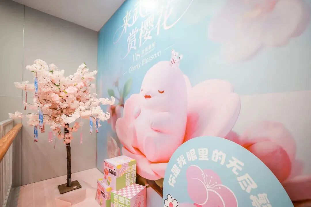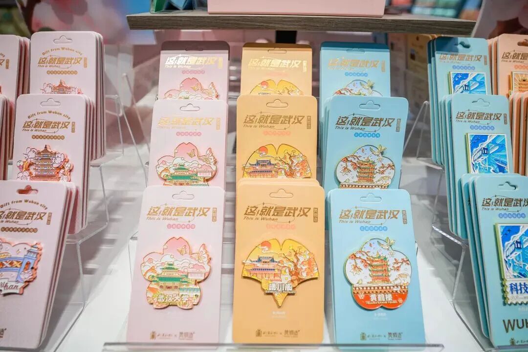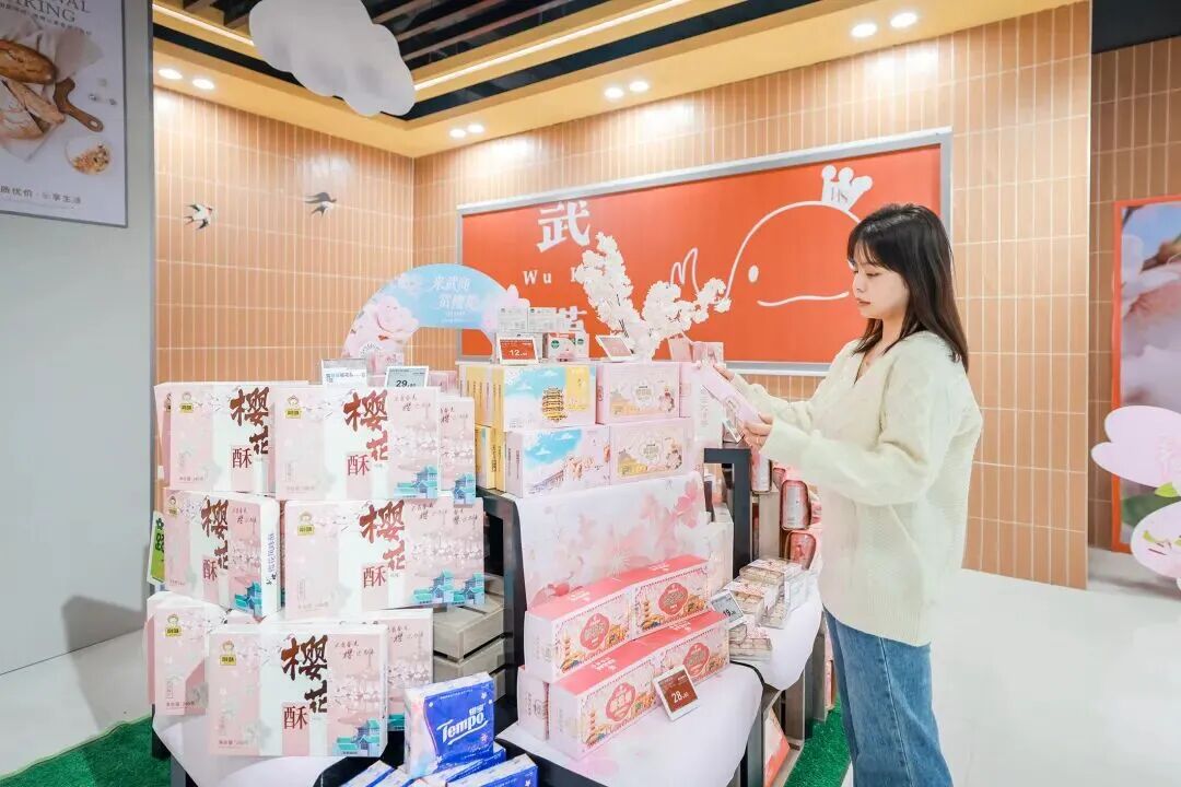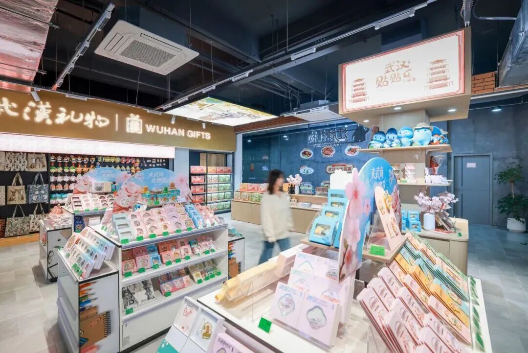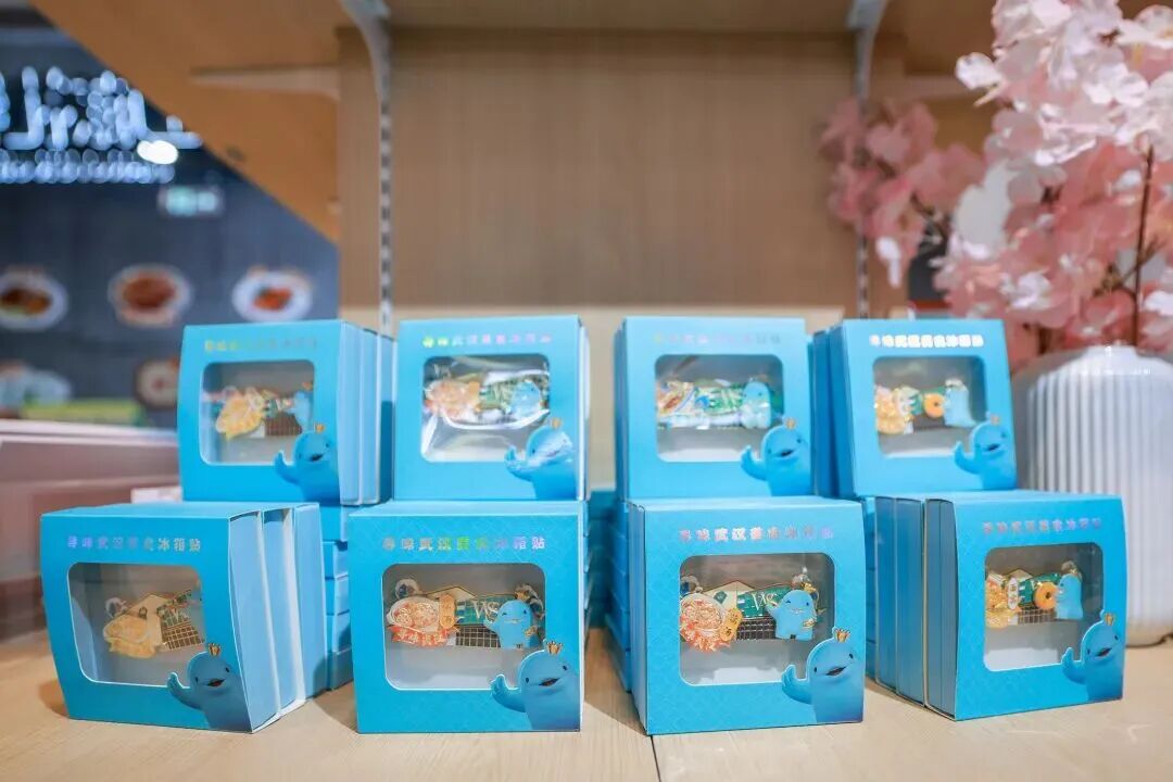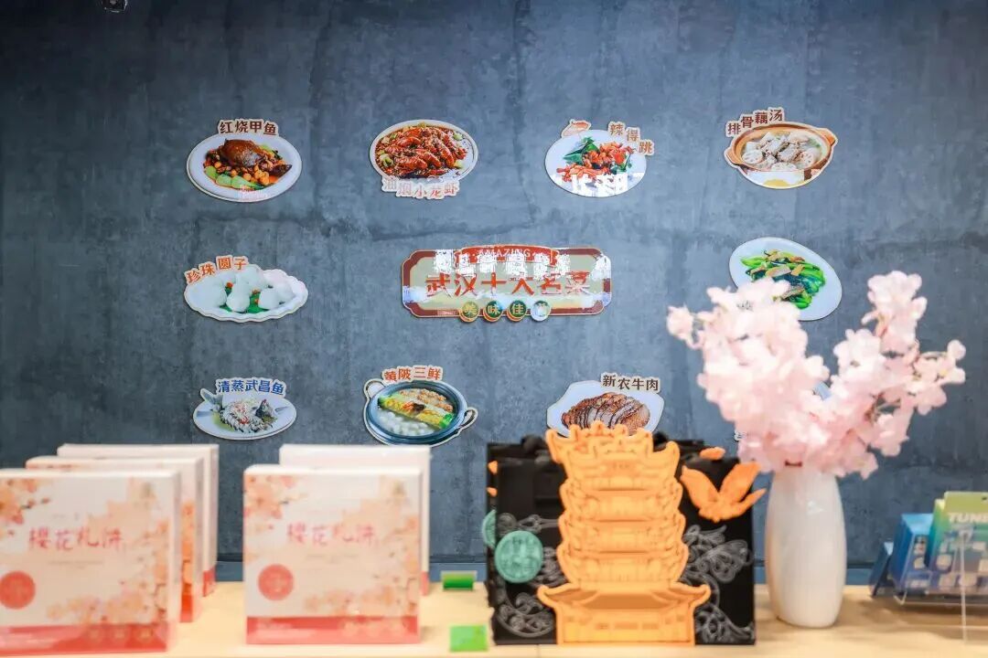 顺着樱花花瓣地贴往里走,是特色打造的江豚礼物专区,涵盖了湖北优质农产品和伴手礼,武汉特色文创和超优质的江豚优选品牌,盛装迎客。