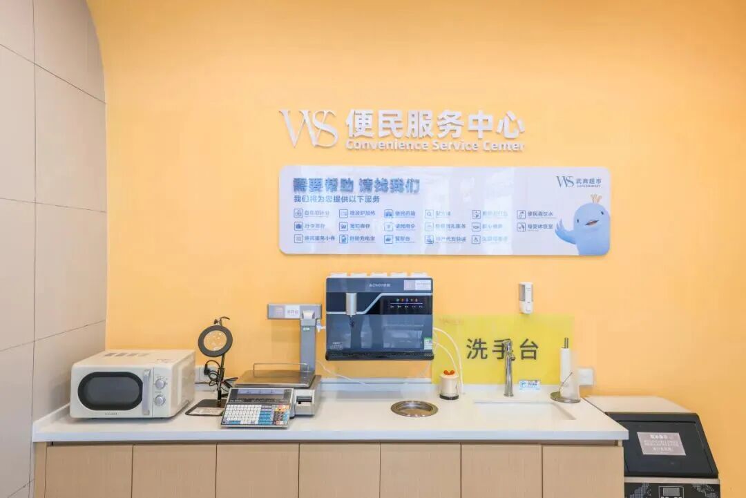 考虑拖着行李箱游逛的外地游客需求,超市一楼设有寄存柜、宠物友好箱,二楼公共服务空间,免费提供放大镜、糖果等民生物品,顾客可免费打直饮水、免费取冰,使用微波炉。有两位外国游客,原本只是想上二楼打水,明亮的室内空间,欢乐的音乐广播,让她们心情大好,踩着樱花地贴,欢快地跳起舞来。