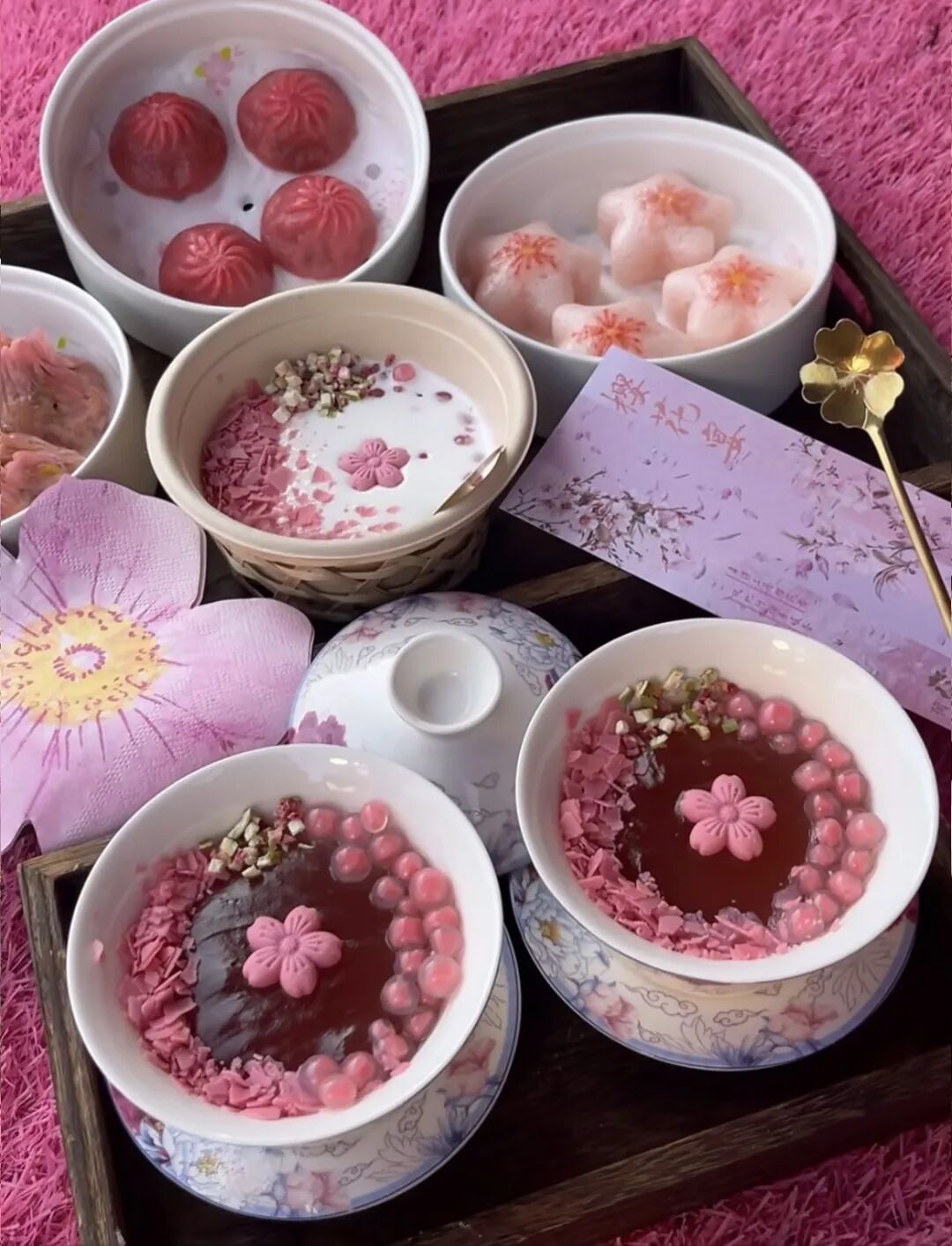 “在武汉,连吃饭都能感受到樱花浪漫。”不少外地游客在社交媒体上感叹。樱花季期间,武汉餐饮界掀起“樱花入馔”热潮。武汉的餐厅推出了樱花糕、樱花面、樱花汤包、樱花烧卖、樱花米酒汤圆、樱花炒饭,大约55%的大餐饮企业推出了樱花相关美食。距离东湖樱园仅500米的荷宴餐厅,推出全套“樱花宴”——樱花炒饭、樱花藕粉、樱花石榴包等十余道菜品,连纸巾、肥皂都做成樱花造型,成为“每桌必点”。