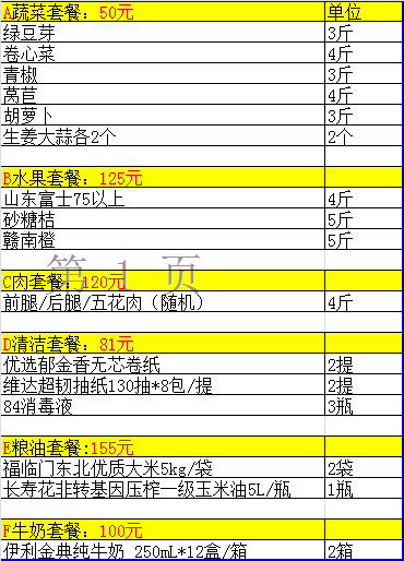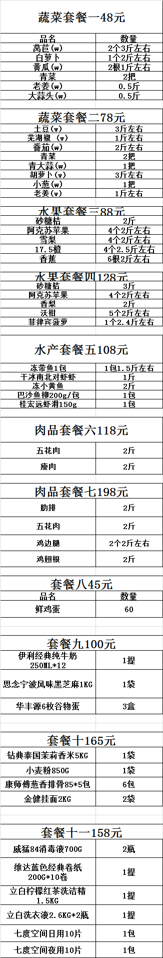 中百超市在武汉市内门店较多,目前各个门店也推出相应的套餐,有生鲜类、米面油类、日用商品类等,并没有统一的发布。有需要的社区团购,可以直接前往就近的门店进行购买。