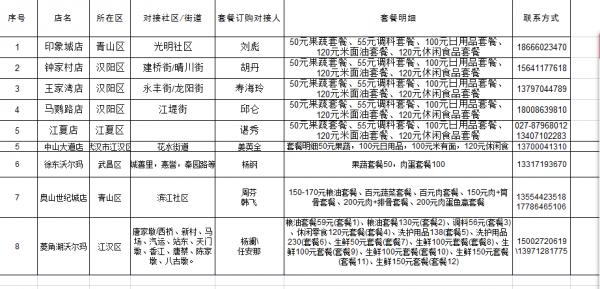 为了保障各居民的生活需求,武商超市推出了“小区/社区生活套餐”,小区/社区代购员(采购组)负责统计本小区所有住户的购买需求,提供给超市后,可按社区居民要求供货。同时,超市公布了超市门店联系人及社区团购负责人电话,有需求的居民可以直接联系。
