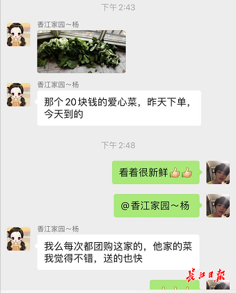 “这一个月来,我们小区已经在长江严选团购了17次,从蔬菜粮油,到水果零食,还有宝妈们急需的婴儿口粮,都能在平台上买到。”东西湖美联奥林匹克花园业主杨彩华,是所在小区团购群“团长”,她向记者展示了小区微信团购群里的业主留言,“质优价廉、品类丰富”是大家对长江严选平台产品的一致评价。