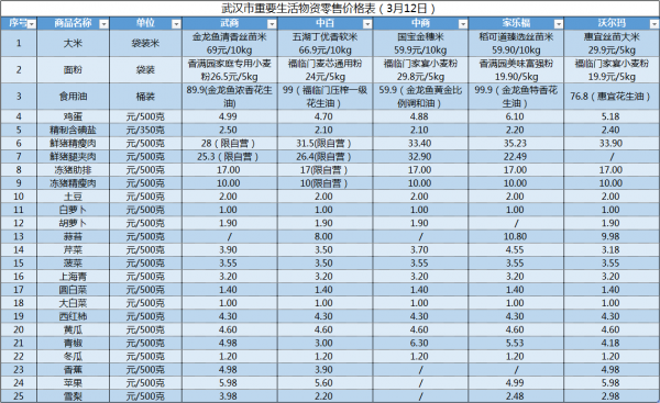 长江网记者在3月12日公布的数据中看到,武商、中百、中商、家乐福、沃尔玛的鸡蛋价格分别为每斤4.99元、4.7元、4.88元、6.1元、5.18元;鲜猪精瘦肉每斤价格分别为28元、31.5元、33.4元、35.23元、33.9元;土豆、白萝卜、胡萝卜等10种蔬菜价格统一;香蕉最便宜每斤3.9元,最贵4.98元;苹果最便宜每斤4.99元,最贵5.98元。