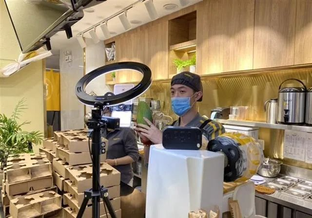 在银泰创意城,一家饮品店店员小张,现场展示着一款款网红饮品的制作过程。“宝宝们你们看,这是今天刚到的芒果,我们的饮品,都是新鲜水果现榨的……”店铺负责人介绍,尽管店内堂食区已经开放,但大部分顾客来源还是外卖渠道,“我们五一小长假期间,营业期间会持续直播,让消费者购买更安心。”