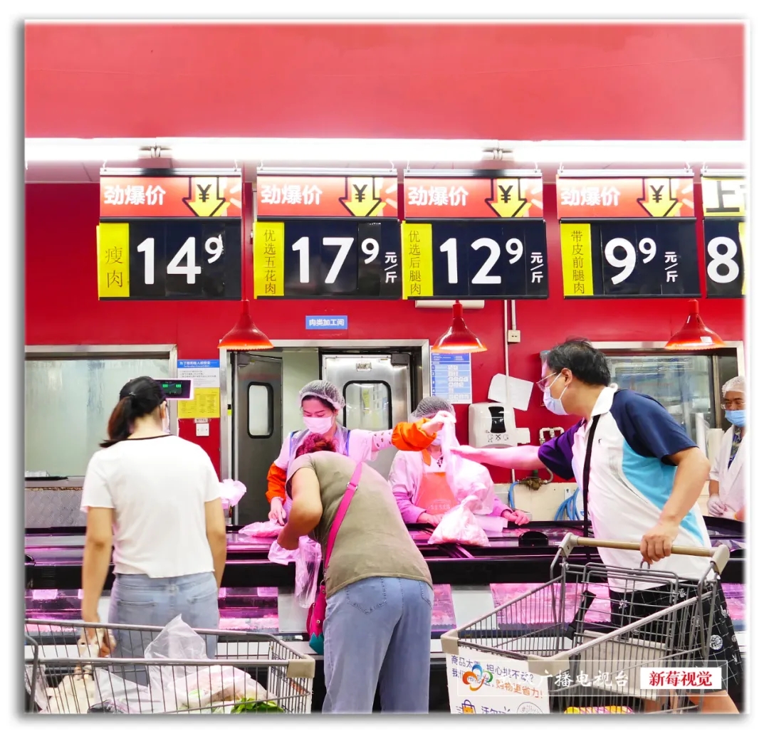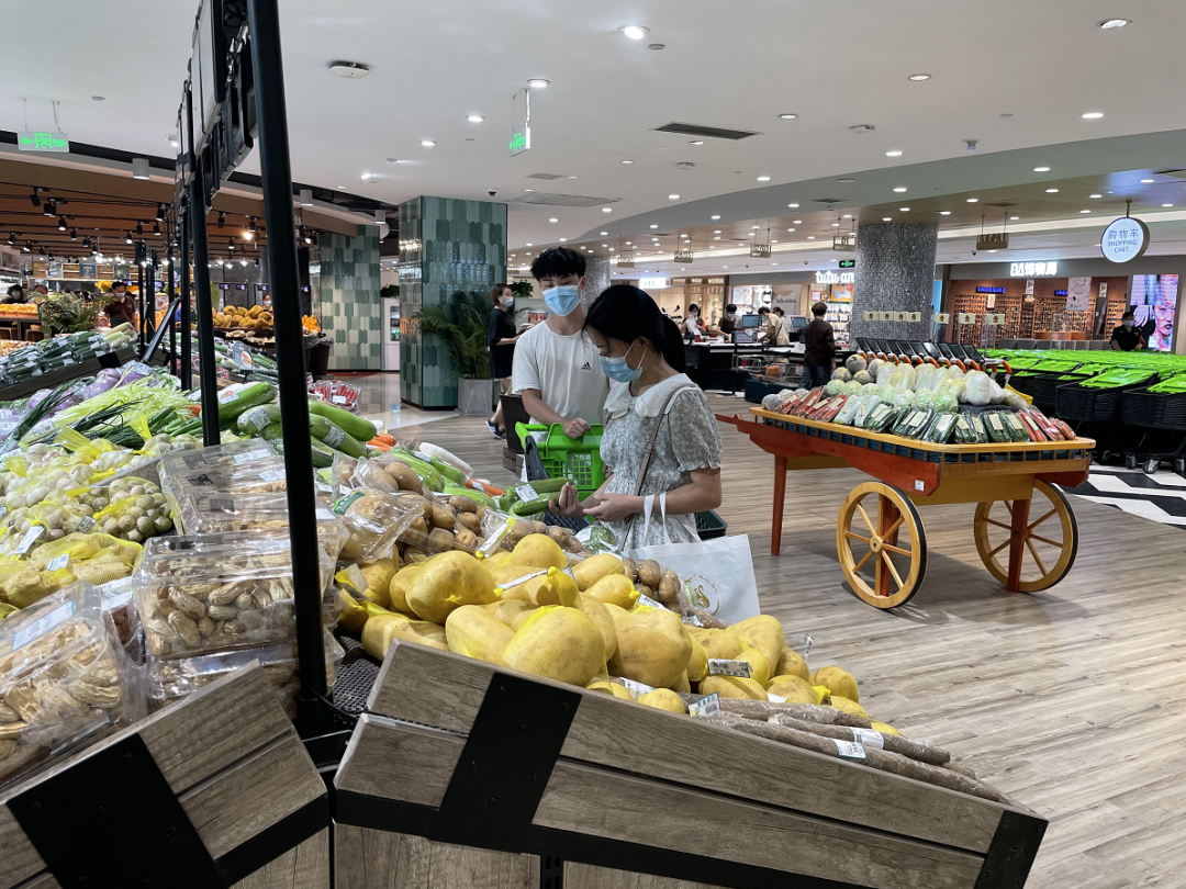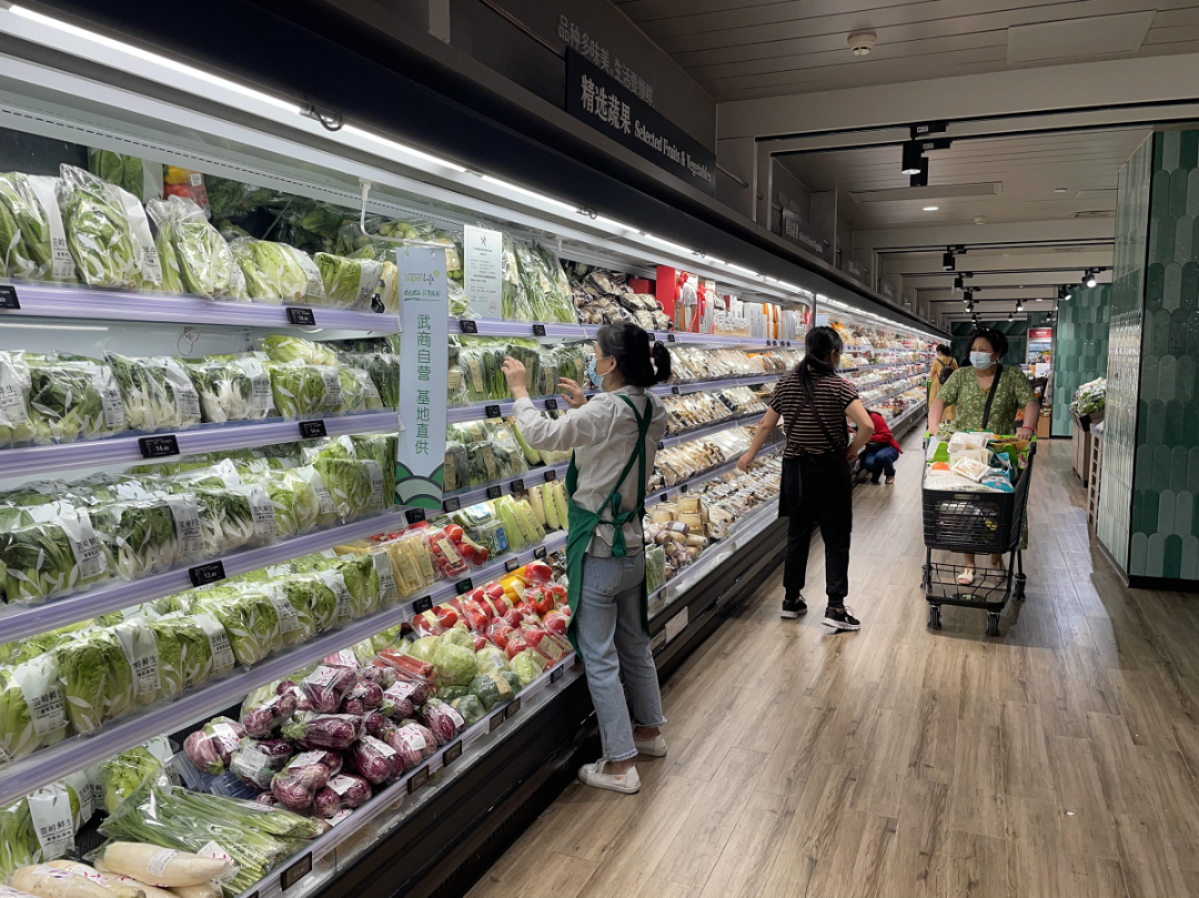 走进卖场,货架上满满当当,各类生鲜、生活物资均有充足供应,购物市民和往常差不太多。