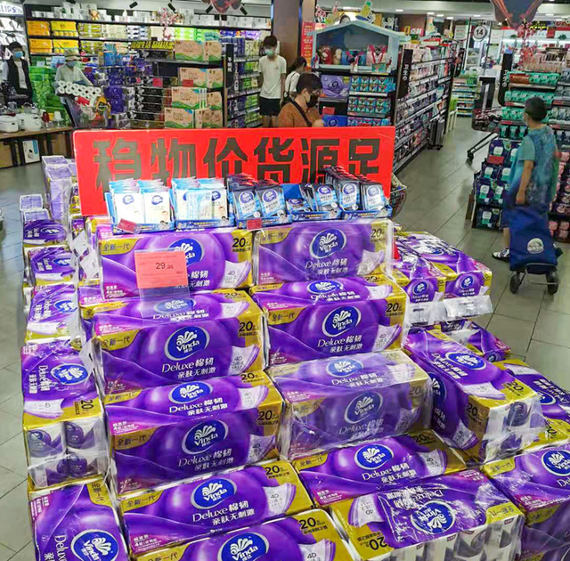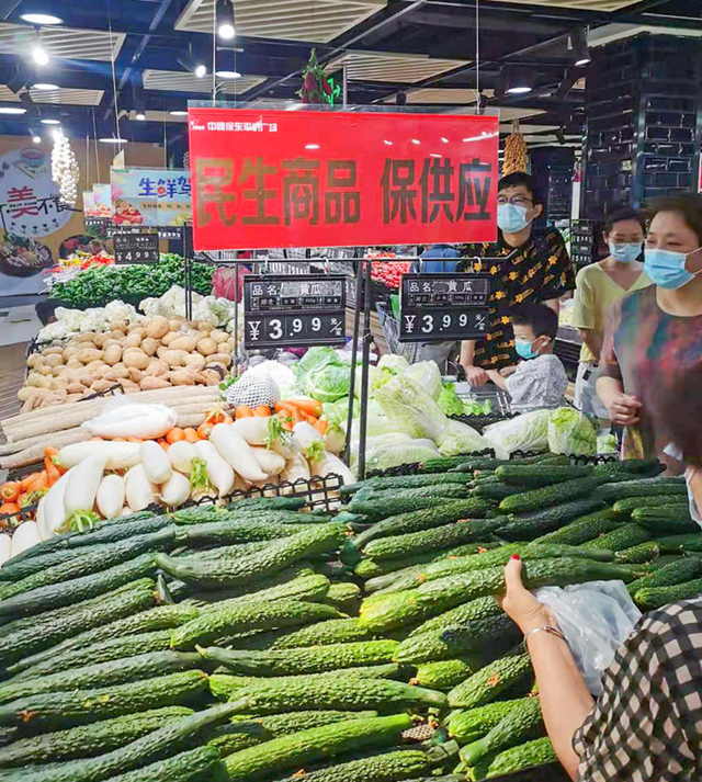 中商超市徐东店里,各类蔬菜、水果未断档,日用品备货充足,“稳物价货源足”“民生商品保供应” 等提示标语格外醒目。该店负责人告诉记者,确实有一些市民来采购一些民生商品,购买量比平时要大,但并未出现哄抢现象。