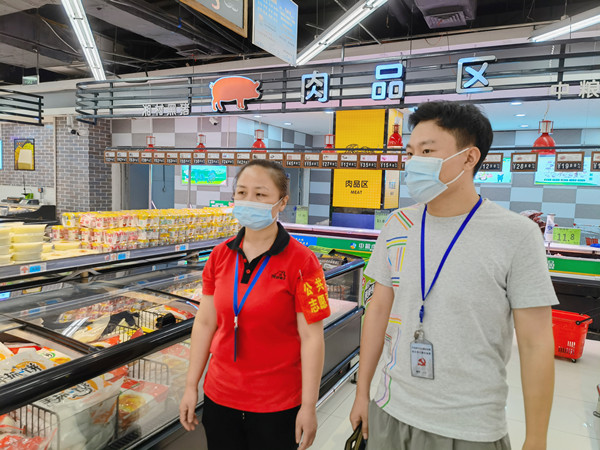 督查组工作人员在商超监督检查生活物资储备情况。