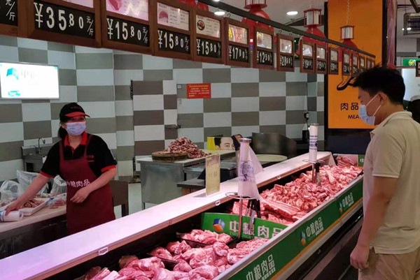 督查组工作人员在超市督导检查肉制品供应情况。
