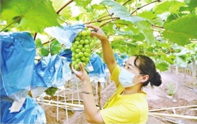 8月19日,在东西湖区东山街群力大队刘亮葡萄园,村民王芳正将刚采摘下来的阳光玫瑰葡萄打包,装箱后准备运往北京、上海、深圳等地。当天,该葡萄园通过快递销售葡萄已达800多箱。