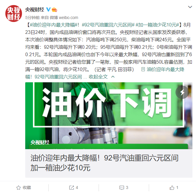 发布日期:2021-08-24 09:30:43 文章来源:长江网8月23日24时,国内成品油调价窗口将再次开启。记者从国家发改委获悉,本次油价调整具体情况如下:汽油每吨下调250元,柴油每吨下调245元。全国平均来看:92号汽油每升下调0.20元;95号汽油每升下调0.21元;0号柴油每升下调0.21元。本轮国内成品油调价也创下今年以来最大跌幅,92号汽油也重新回到了6元的区间。记者给您算了一笔账,按一般家用汽车油箱50L容量估测,加满一箱92号汽油,将少花10元。