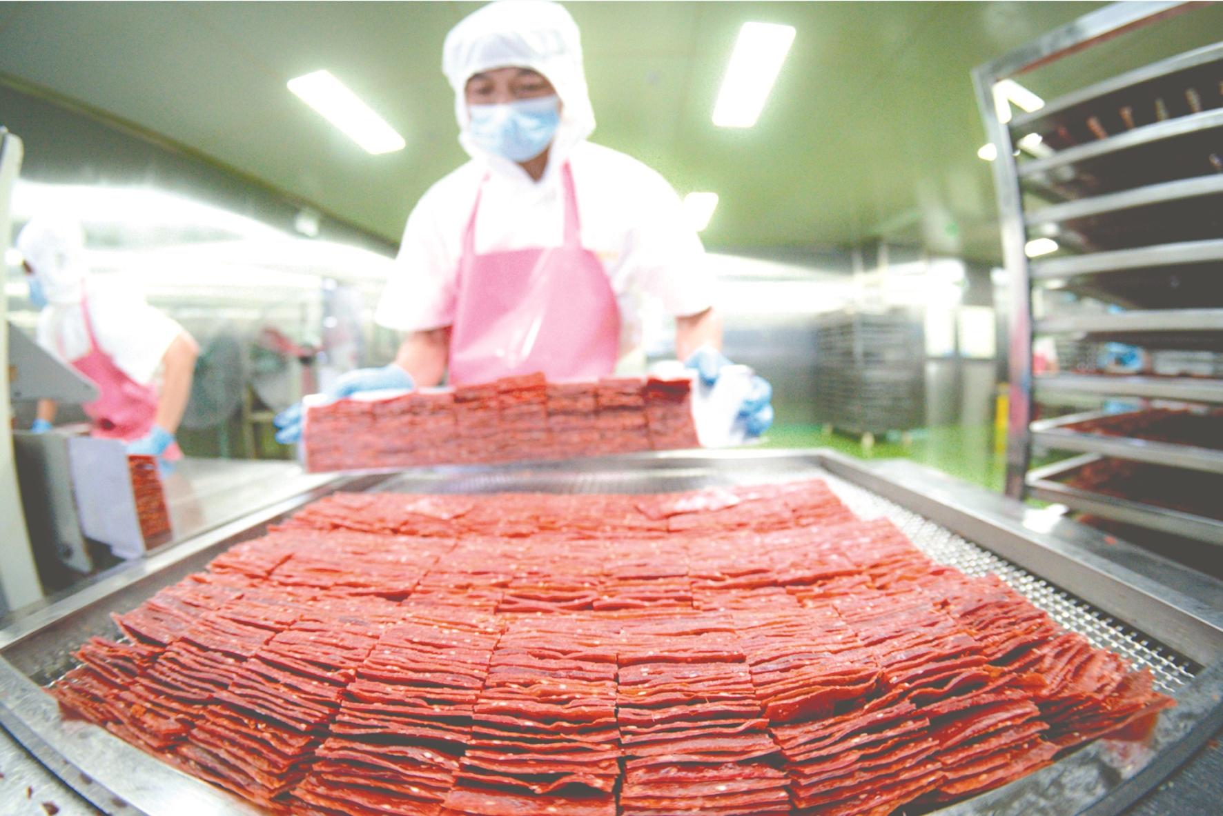在江苏靖江,良品铺子对肉脯原料定下死规定:只挑瘦肉更多、纤维更粗的三元猪(三个品种杂交的猪),这样制成的肉脯韧劲足、更好嚼;只挑猪后腿上的两大块——奶泊肉、老板肉,它们肉质细嫩、脂肪含量低、蛋白含量高、筋膜少,做出的肉脯更少油腻。“按良品铺子的要求,一头猪只能用两只后腿上的四块肉,两斤鲜肉才能制作出一斤肉脯。”靖江工厂生产负责人介绍,良品铺子对生产工艺的要求更是严苛到毫米,肉切薄了不容易摊筛成型、切厚了影响均匀度和口感,以经典肉脯为例,良品铺子经过多次调试最终将肉片厚度定为2.3毫米,多一点少一点都不行。对产品的研发也是不断满足消费者口味的变化。2021年,良品铺子在行业率先推出高蛋白肉脯,较经典肉脯蛋白含量更高,油脂含量更低,满足消费者追求健康营养的需求。