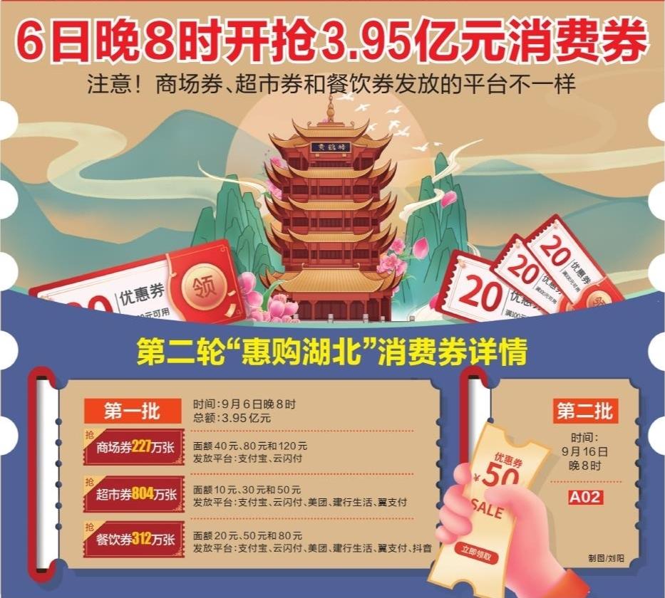 第二轮“惠购湖北”消费券6日开抢 首批总额3.95亿元 药店消费纳入超市券核销范围