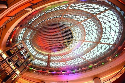 在5楼“梦之眼”区域,记者抬头仰望,半透明“梦之眼”穹顶深邃透亮,与观光梯玻璃外墙上的倒影交织,似灵动的双眸。