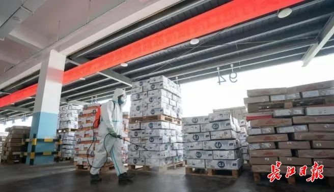 ▲鄂州万吨冷库内,防疫工作人员正在消杀