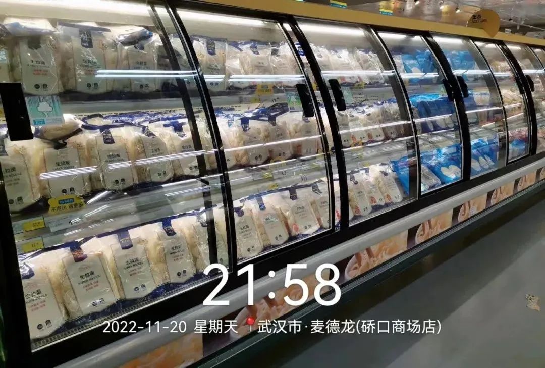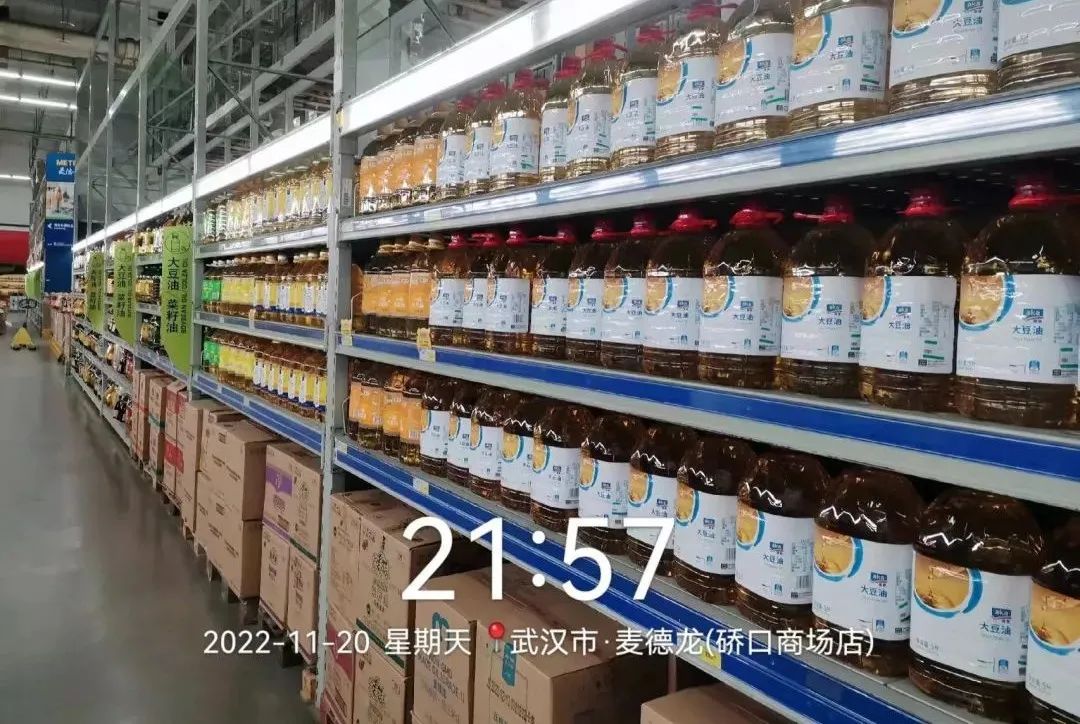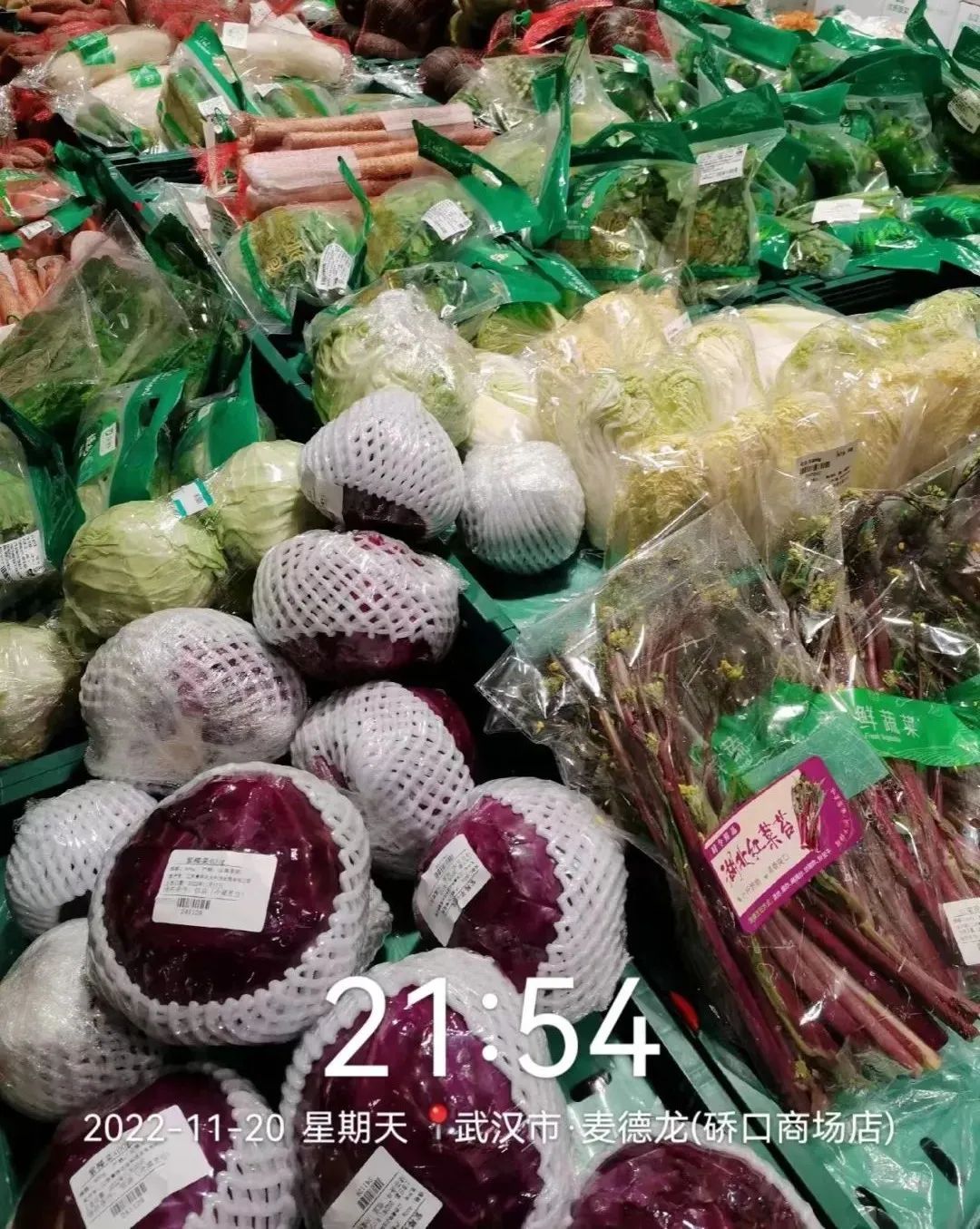 11月20日21:50,经过紧急调度调配,麦德龙硚口店内的货架又是满满当当的,店内生鲜区、果蔬区、肉品区域以及深受孩子们喜爱的面包与牛奶区域货品齐全,当晚为了配合市民购买生活物资,店内将营业时间延长至23:00。