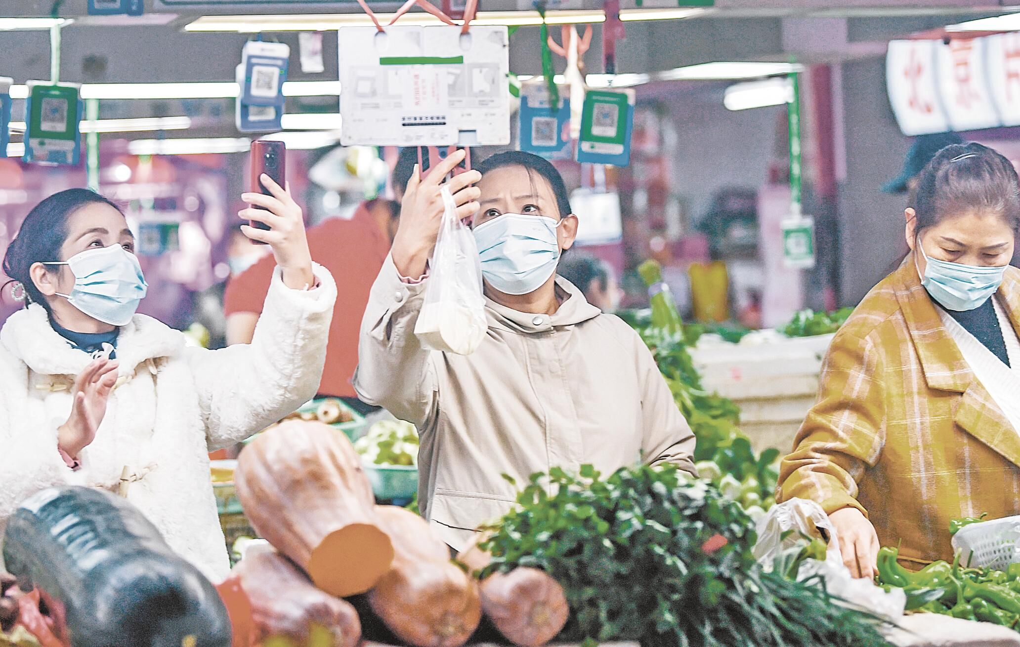 11月29日,武汉市洪山区园林路某农贸市场在做好防疫措施的基础上正式恢复营业,市民扫码并测量体温正常后,有序进入菜场。