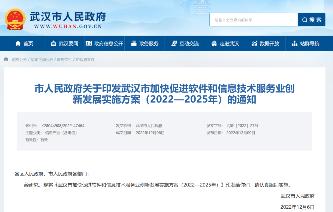 发布日期:2022-12-13 08:45:19 文章来源:武汉商务近日,武汉市发布《武汉市加快促进软件和信息技术服务业创新发展实施方案(2022—2025年)》,明确加快促进软件和信息技术服务业十大重点领域,旗帜鲜明提出到2025年,武汉软件业务收入突破4000亿元。