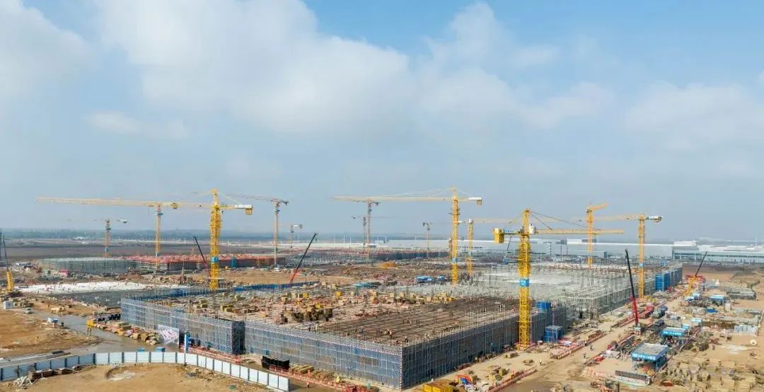在中创新航动力电池及储能电池武汉基地项目三期项目部现场,主体结构正在加紧施工,待武汉基地全部建成、完全达产后,产能可达50GWh,每年生产的动力电池可以装配超50万辆新能源汽车。