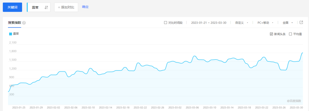 通过百度指数搜索“露营”一词可以看到,2023年1月份开始,“露营”的热度有明显上升的过程,搜索指数从低峰时的400攀升到高峰期时的1800,翻了约四倍。