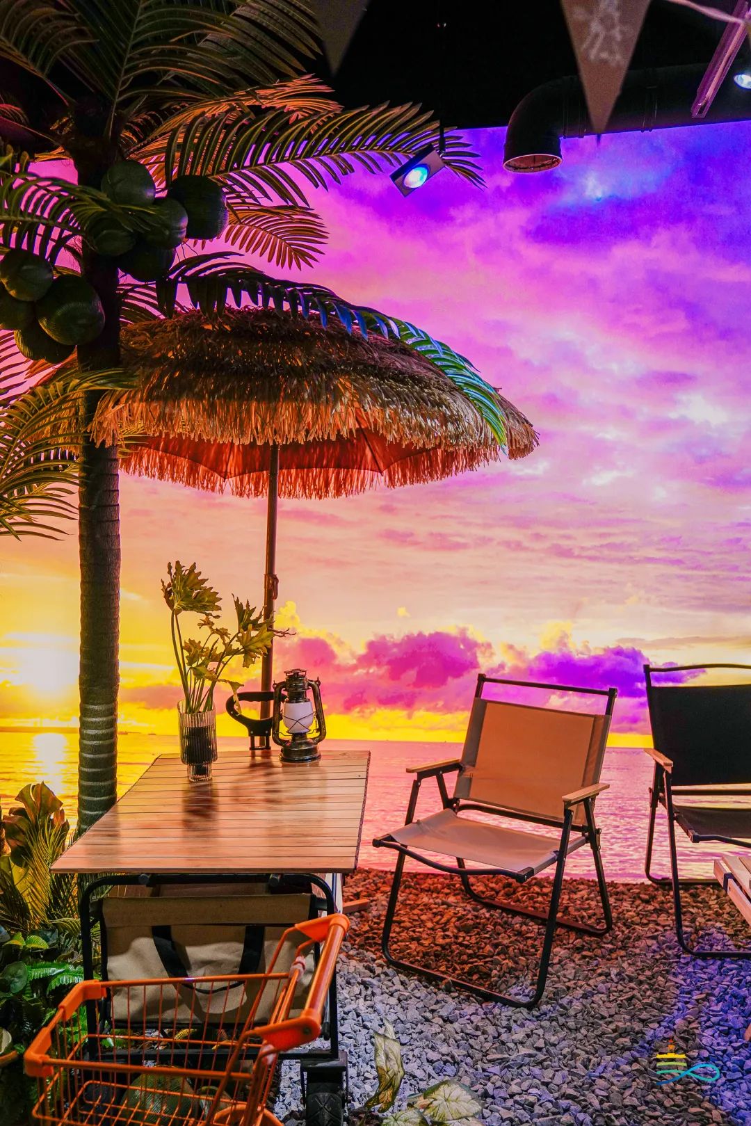 江汉路上的「武太炸·乐山油炸串串」,店内装潢主打当下最火的露营风,原木桌椅、复古露营灯,搭配海边落日余晖超大屏幕,不出武汉就能感受海边露营的快乐,氛围感拉满,随手一拍都出片。