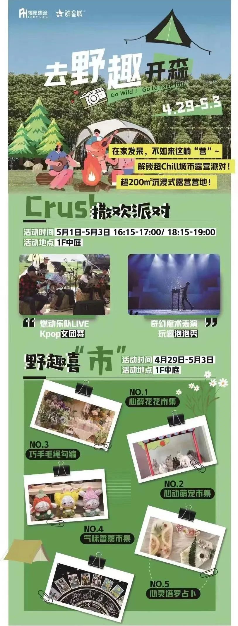 “江滩园游会”(4.29-5.3):活动在汉口江滩长春门至永清门举办,活动针对亲子出行推出了包含露营野炊,晒照遛娃,潮流市集、逛吃休闲等多种丰富的业态,活动设置了孩童手作、露天电影、汉服体验等多种互动项目,并设有美食集市,活动现场用帐篷进行搭建,再用森系绿植进行装饰,打造一场城市中的露营嘉年华。