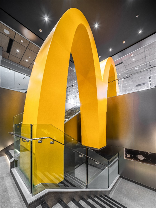 金银湖199+餐厅占地面积超过528平方米,拥有上下两层,可同时容纳150名顾客用餐,大幅全透明落地玻璃为餐厅增加阳光和空间感。餐厅以童趣太空为主题元素,大量使用银灰色金属材质,营造“太空舱”式的科技和未来感。外立墙面上的卡通宇航员童趣十足;餐厅里面,麦当劳经典产品图案变身太空中的星球,闪闪发光。餐厅特别设计了“童趣星空”旋转楼梯,连接餐厅的上下两层,标志性的金色拱门伫立在楼梯中间,星空墙画延伸在楼梯两侧,点点灯光下营造出充满想象力与童趣的星际太空。