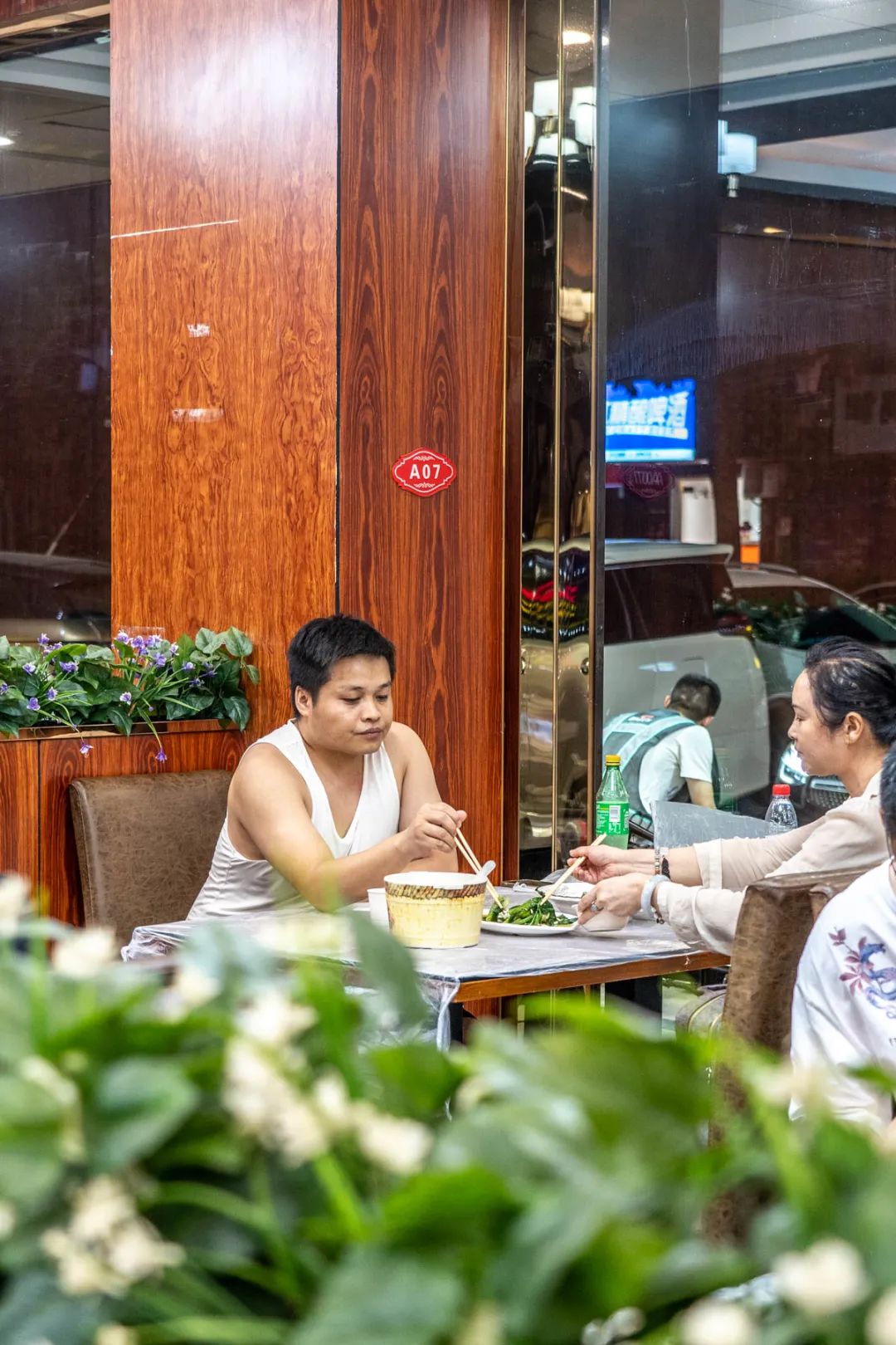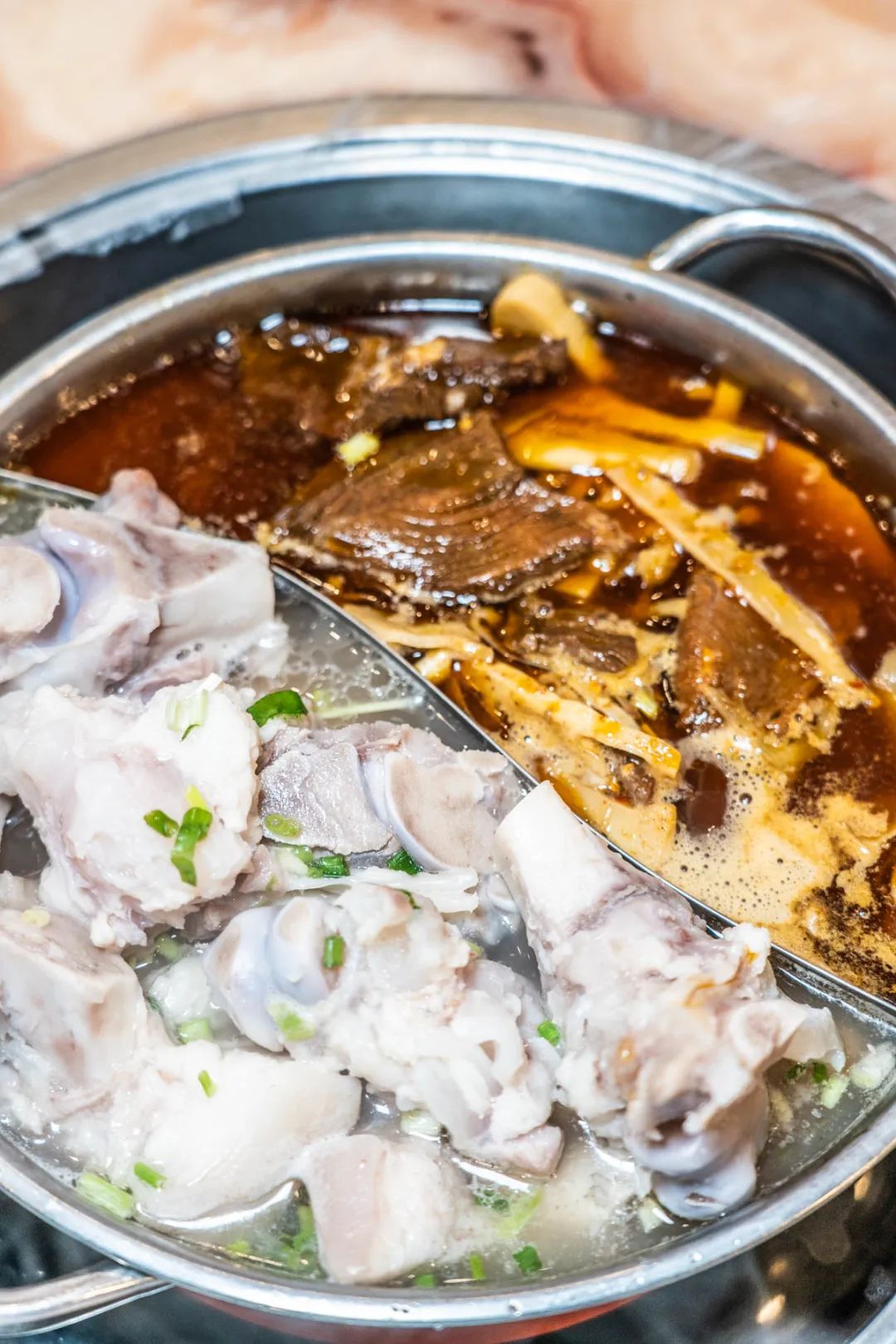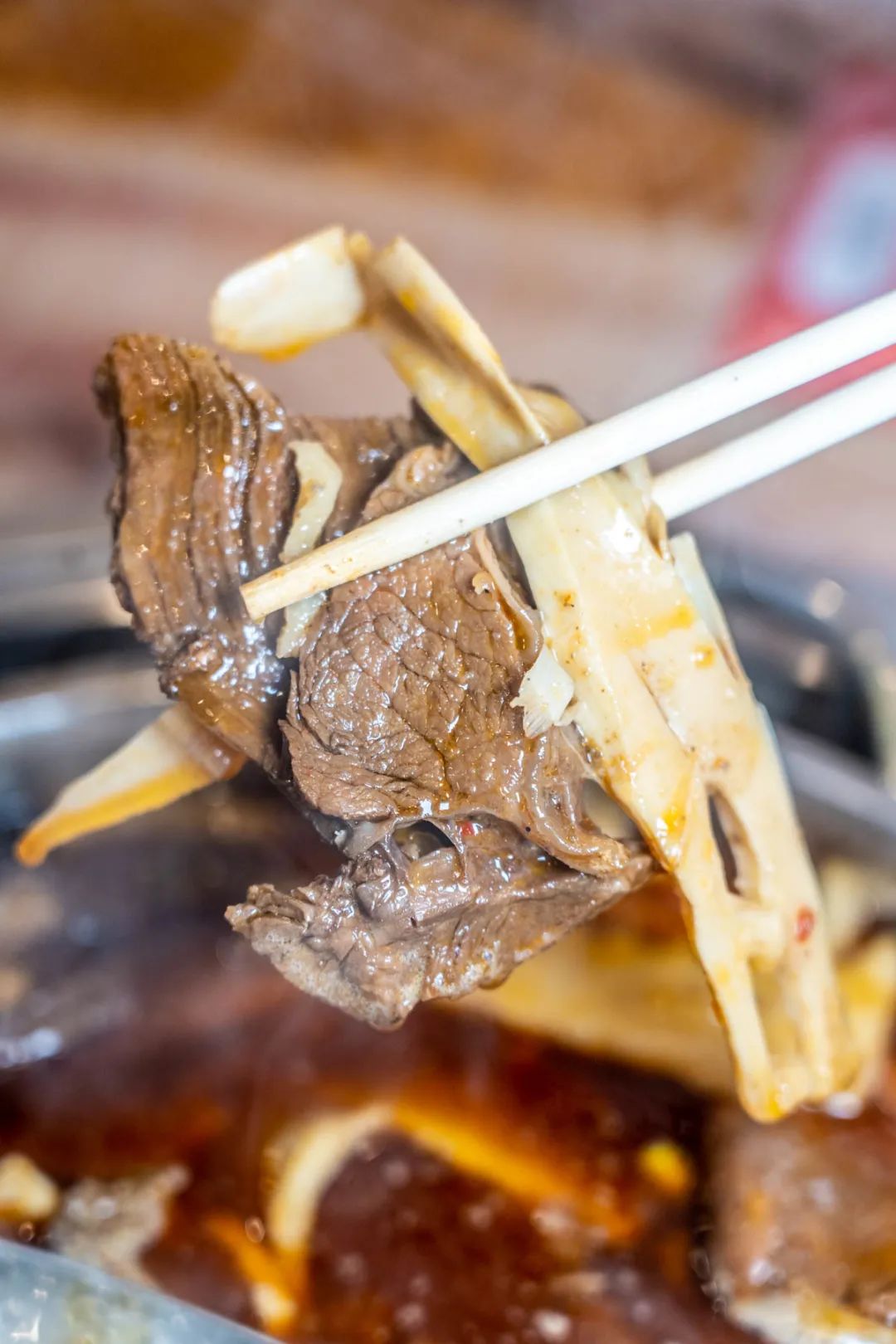 猪弯弯是指猪的膝盖骨,筋多有嚼劲,满满的胶原蛋白。剩下的骨头里藏着骨髓,这可是精华所在。一份猪弯弯拼牛肉笋子火锅,是他家长盛不衰的头牌菜。个头大的猪弯弯熬得鲜而不腥,大口吮吸,肥美的肉筋瞬间脱入口中,混合着汤汁,满嘴肉香。清亮的浓汤钝出诱人的奶白色,配上打底的野莲藕,滋补身心。另一边的牛肉笋锅被小火炖得鲜红,夹起一片牛肉,香辣的汤汁渗透进牛肉的每寸肌理,配上香脆的笋片一同入喉,脆爽带劲。咸鲜香辣的二合一组合,吃出了武汉人独有的豪爽与韵味。