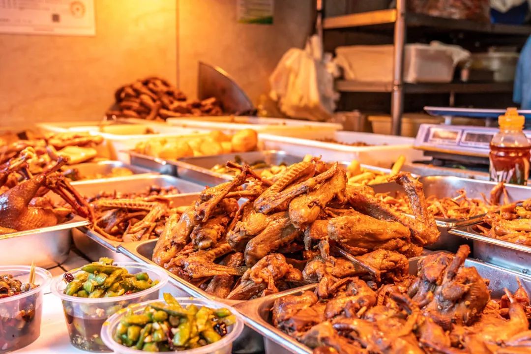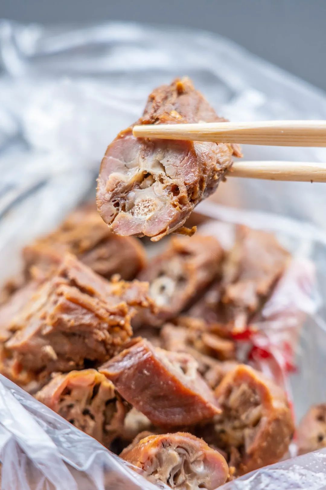 武汉黄毛鸭脖千千万,但玫瑰街的这家才是正儿八经的黄毛鸭脖“鼻祖”,做了十几年,是郭茨口一带有名的“卤菜大王”。不到10㎡的店面,有一大半的面积被各色卤味占满。鸭脖、鸭翅、鸭肠、腐竹、土豆……十几种卤味干净的放在盘子里,泛着亮红的油光,勾得人只想点餐。黄毛鸭脖家的鸭脖肉很多,裹着花椒、桂皮等香料的卤汁渗透进骨肉里越吃越爽辣。他家的其他卤味也都是常年畅销的存在,每一口都意犹未尽。
