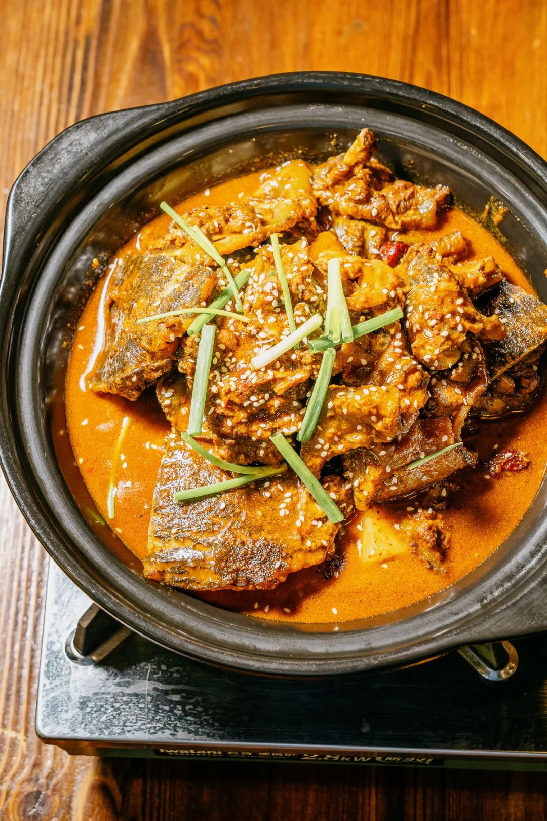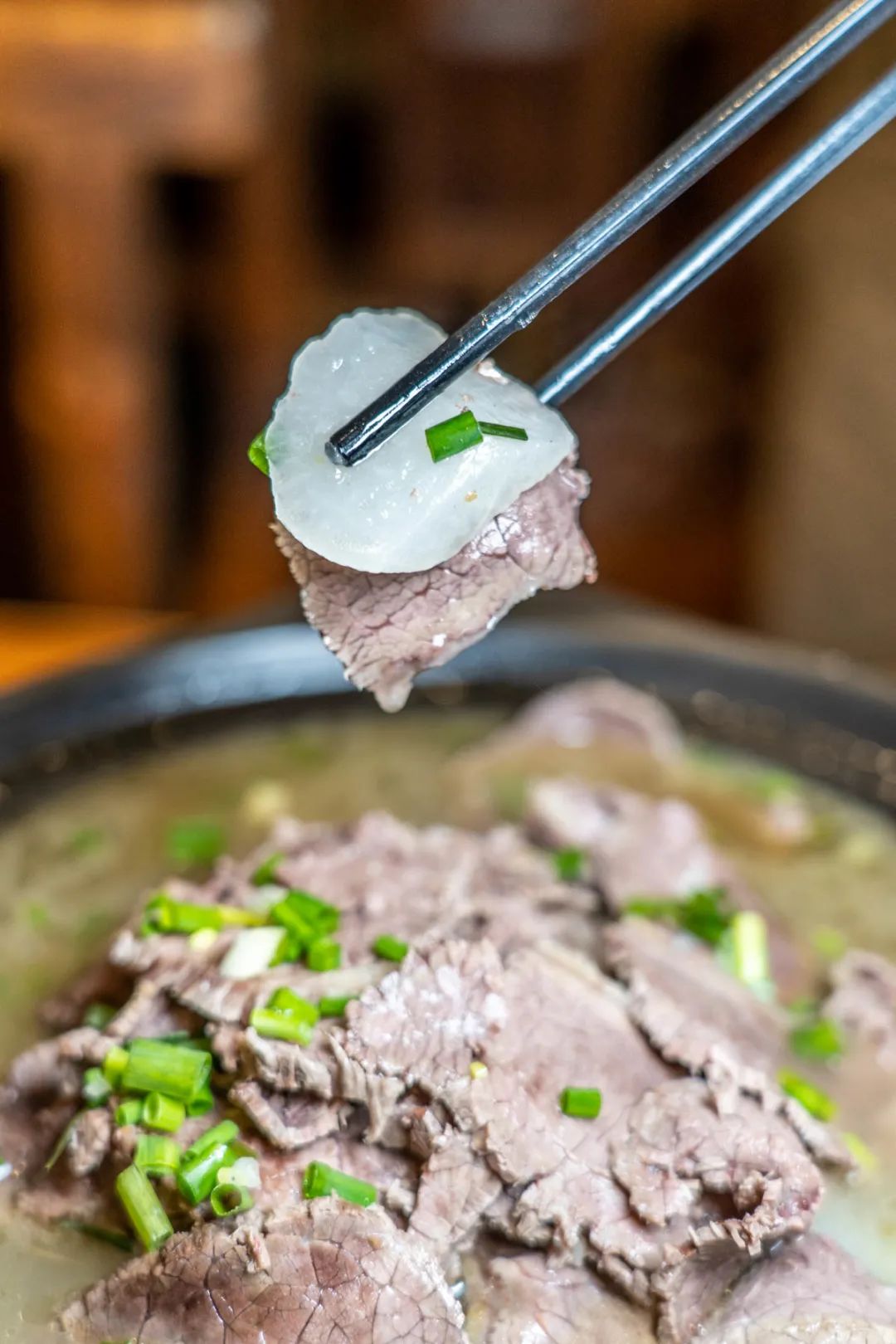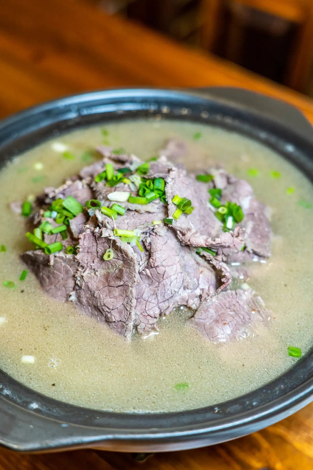 品尝了两道炒菜,再来份砂锅清汤牛肉润润喉最舒服不过。切成片撒上葱花的牛肉格外入味,配上喝饱了汤汁的白萝卜,鲜香浓郁,上桌没多久就会被瓜分完毕。