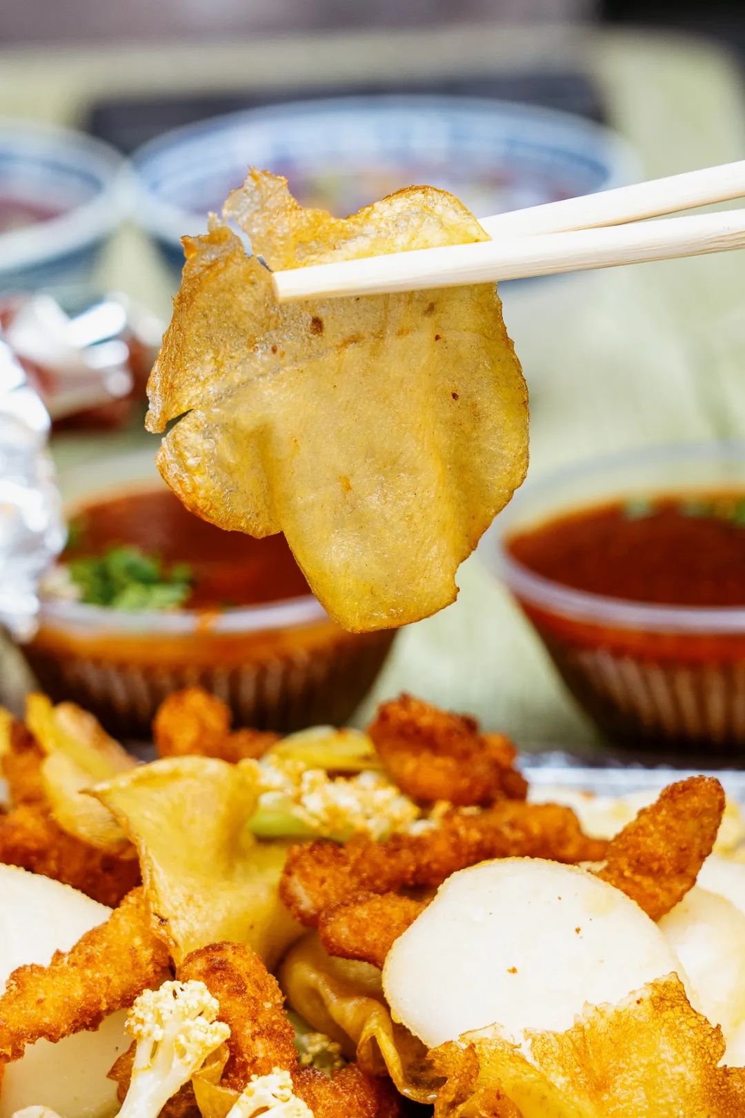 土豆片切得薄如蝉翼,包菜和花菜在油炸的过程中保留了水分和甘甜。肉类也可以闭眼点,其它的就交给蘸酱,等着充满诱惑的那一口记忆味蕾。