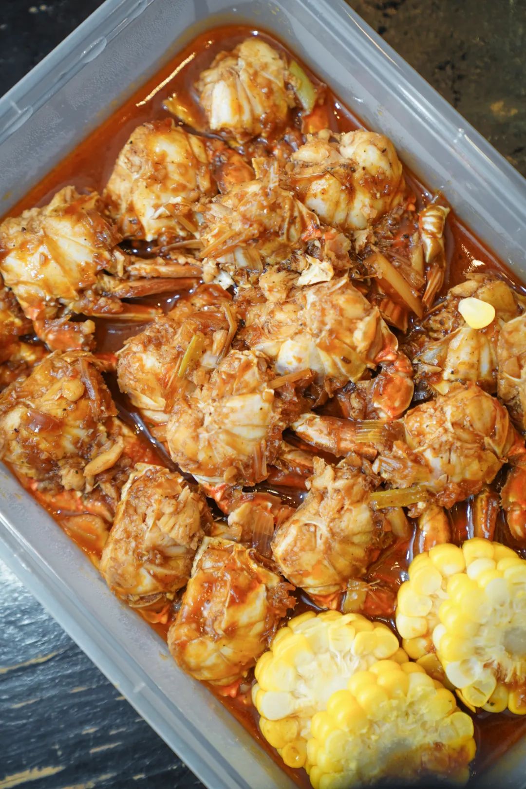 蟹阿金家的螃蟹从视觉上就给人以强烈的印象。这道蟹肉多多菜如其名,酱汁浸泡的肉蟹被整齐码放,打开包装,海鲜和甜麻味的酱汁就直冲鼻腔,右边还加了玉米中和解腻,深得年轻顾客的青睐。