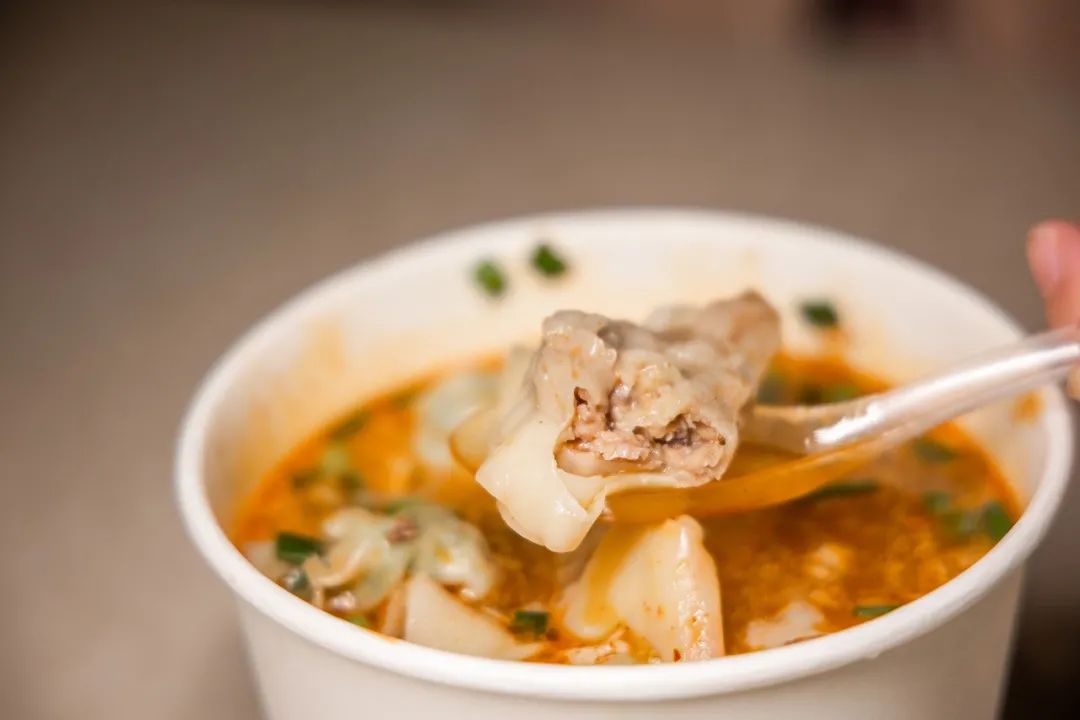 另一个阿姨负责煮,言语间便已经不紧不慢的烫出了一碗抄手。店内自制的酸辣汁是这碗抄手的灵魂所在,酸辣又开胃。被煮的通透的皮紧紧包裹着馅料,足以看出师傅的功力。